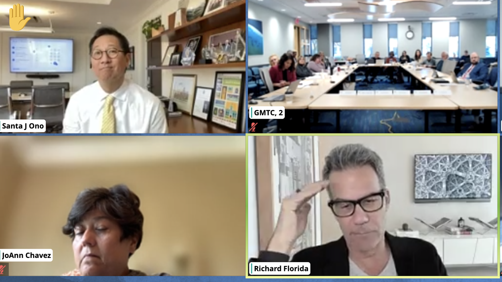 U of M president Santa Ono, DTE senior vice president JoAnn Chávez and researcher Richard Florida speak from Zoom during last week's Growing Michigan Together Council meeting in Lansing. Courtesy: Zoom screenshot