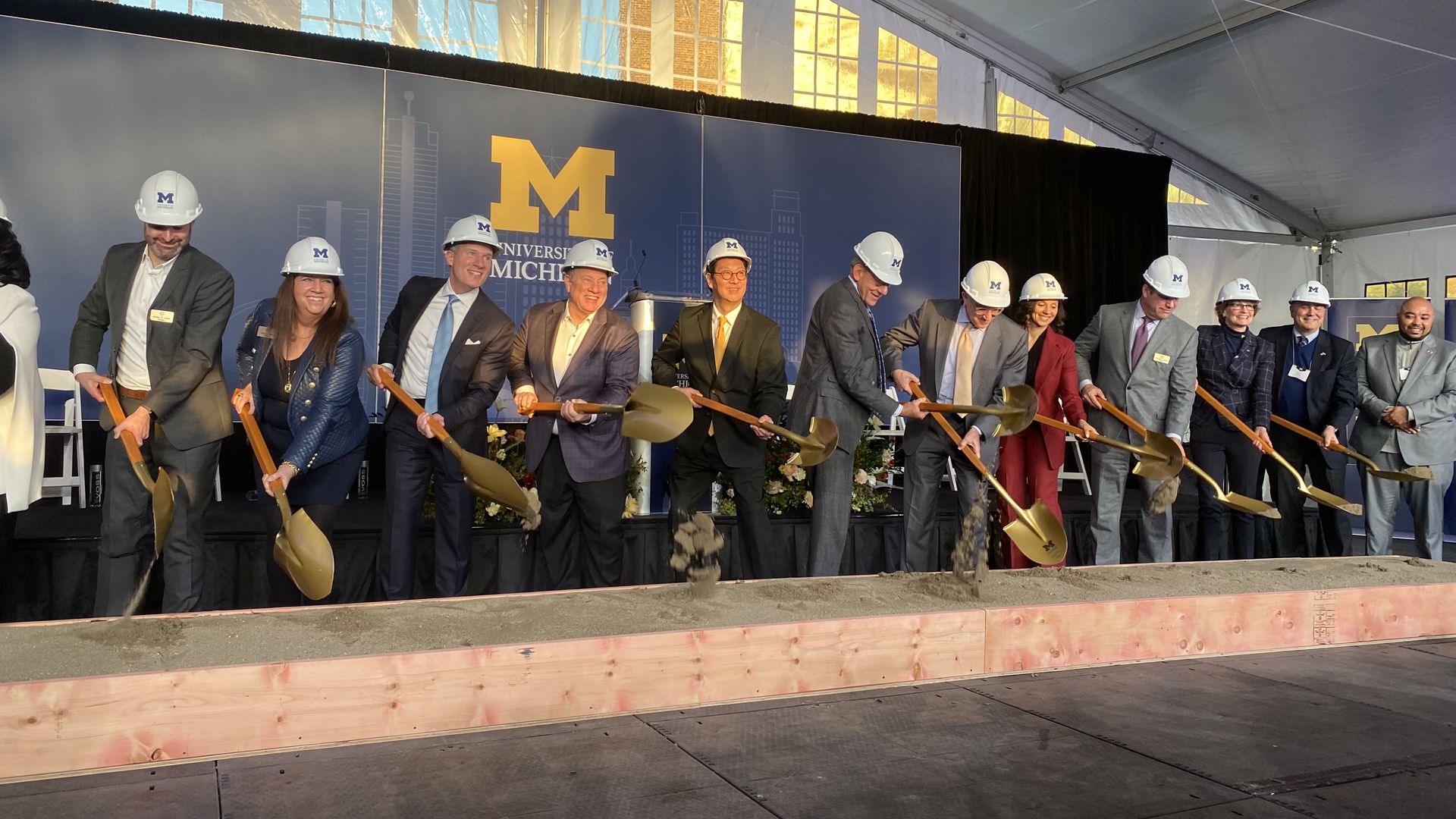 Mayor Mike Duggan, U of M President Santa Ono and others ceremonially broke ground Thursday for the U of M Center for Innovation. The actual groundbreaking is slated for Friday. Photo: Annalise Frank/Axios