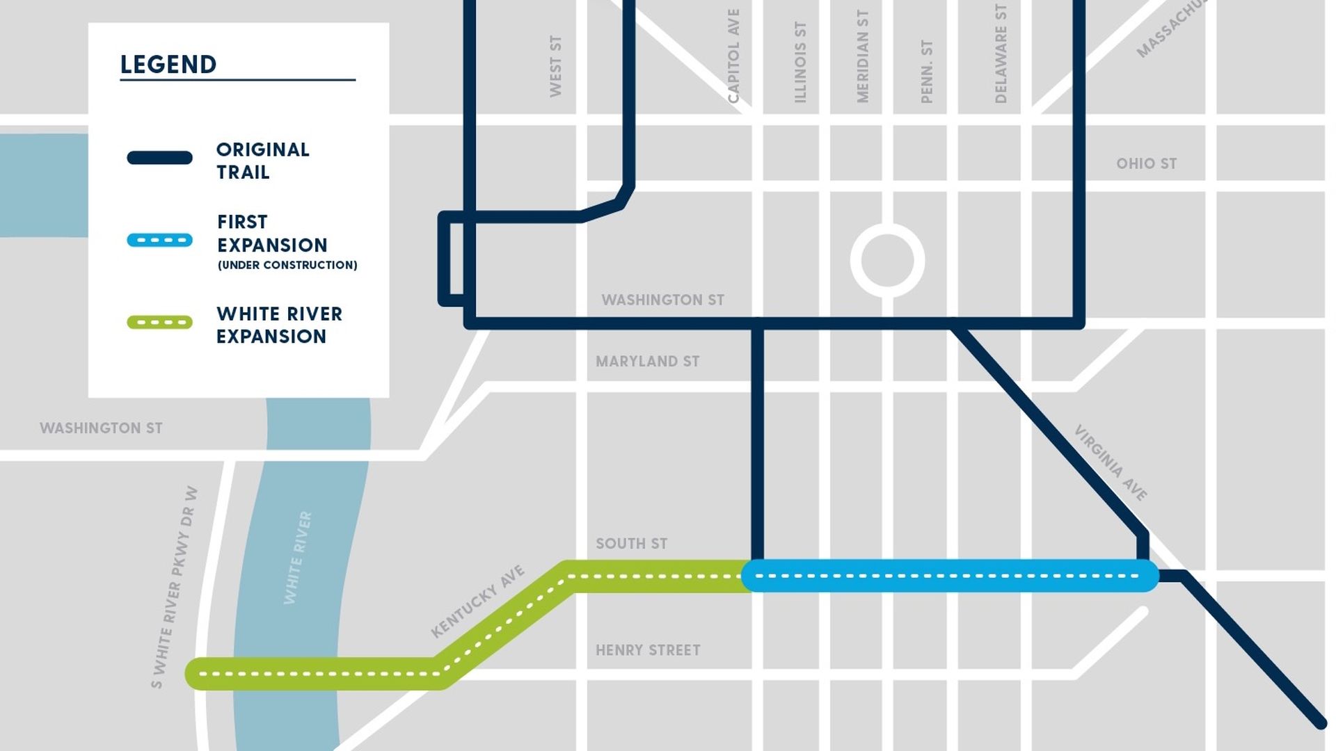 Driving the news: Indianapolis Cultural Trail Inc. and the city announced Tuesday that a one-mile extension of the trail from Capitol Avenue and South Street to two major downtown developments is being planned along both sides of the White River.