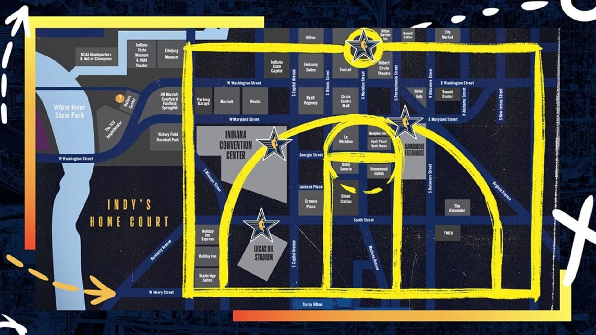 A map of "Indy's Home Court," an area that will host a variety of events in downtown Indianapolis during NBA All-Star Weekend. Photo: Courtesy of NBA All-Star 2024 Host Committee