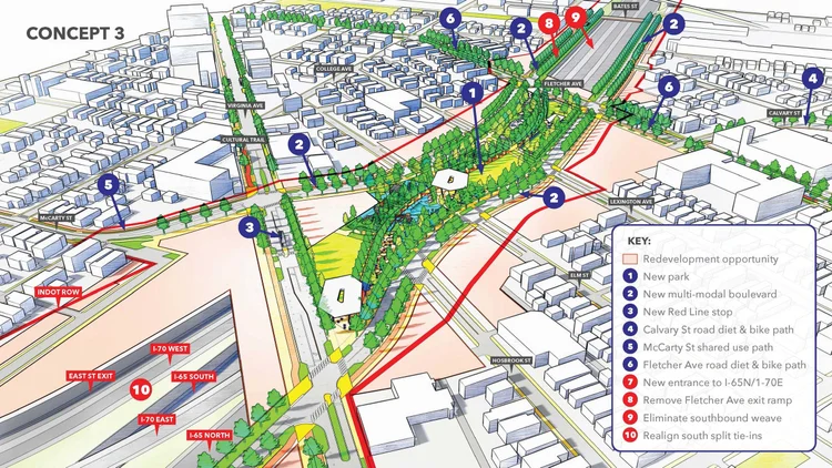 - The most complex plan would modify the current interstate configuration while requiring INDOT and the city to deal with traffic and lane changes well beyond the target area. It would reclaim 12.2 acres valued at $20 million and would add 5 acres of parkland and up to 891 housing units.