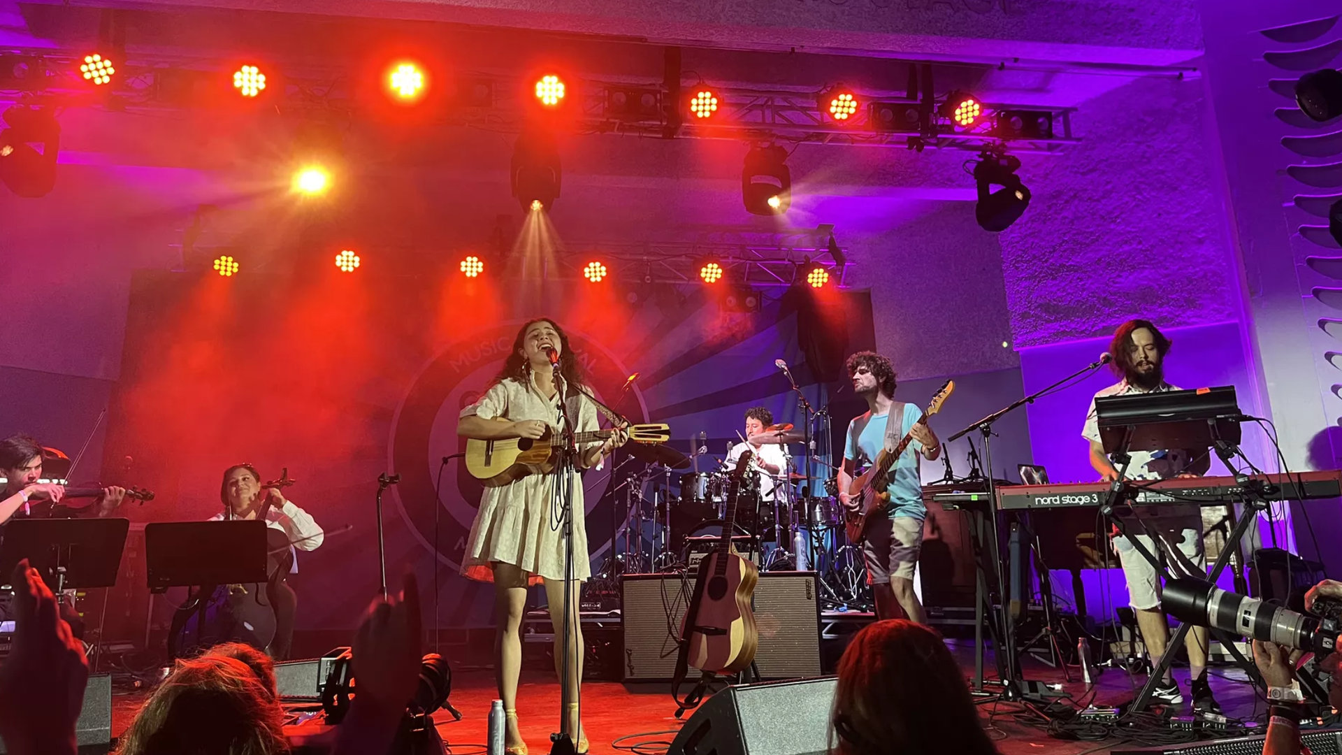 Mexican singer Silvana Estrada performs with Snarky Puppy bandleader Michael League on bass. Photo: Martin Vassolo/Axios