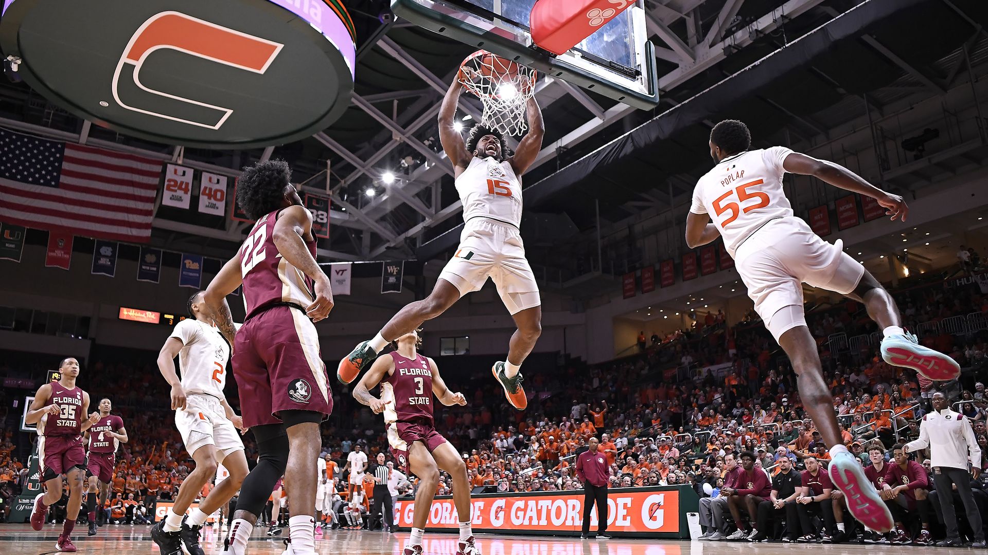 Miami forward Norchad Omier (15) dunks the ball in the first half against FSU as Miami guard Wooga Poplar (55) looks on. Photo: Samuel Lewis/Icon Sportswire via Getty Images