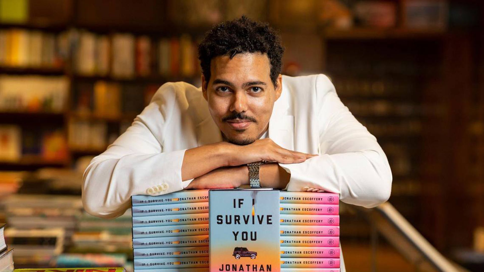 Jonathan Escoffery with his work. Photo: Matias J. Ocner/Miami Herald/Tribune News Service via Getty Images