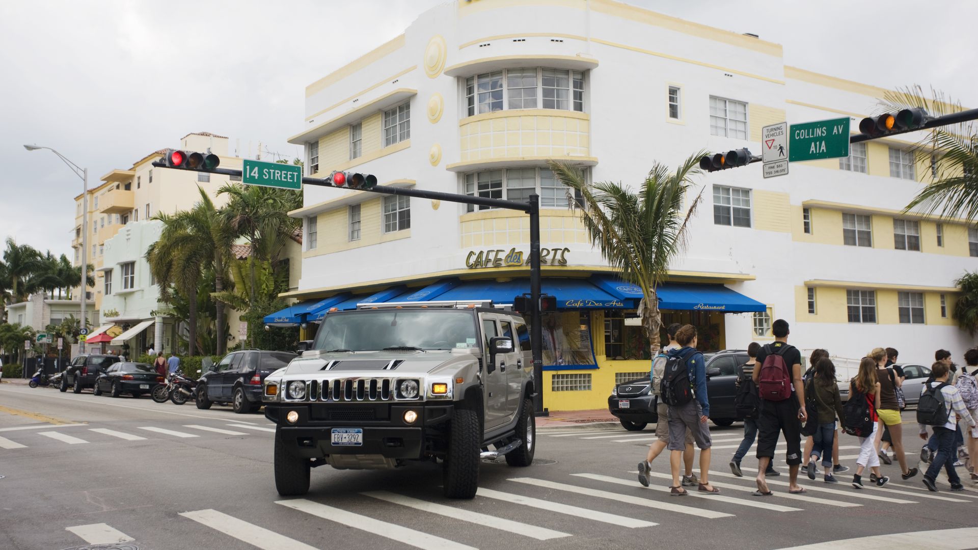 An SUV turns onto Collins Avenue while a group of pedestrians crosses nearby. Photo: Tim Graham/Getty Images