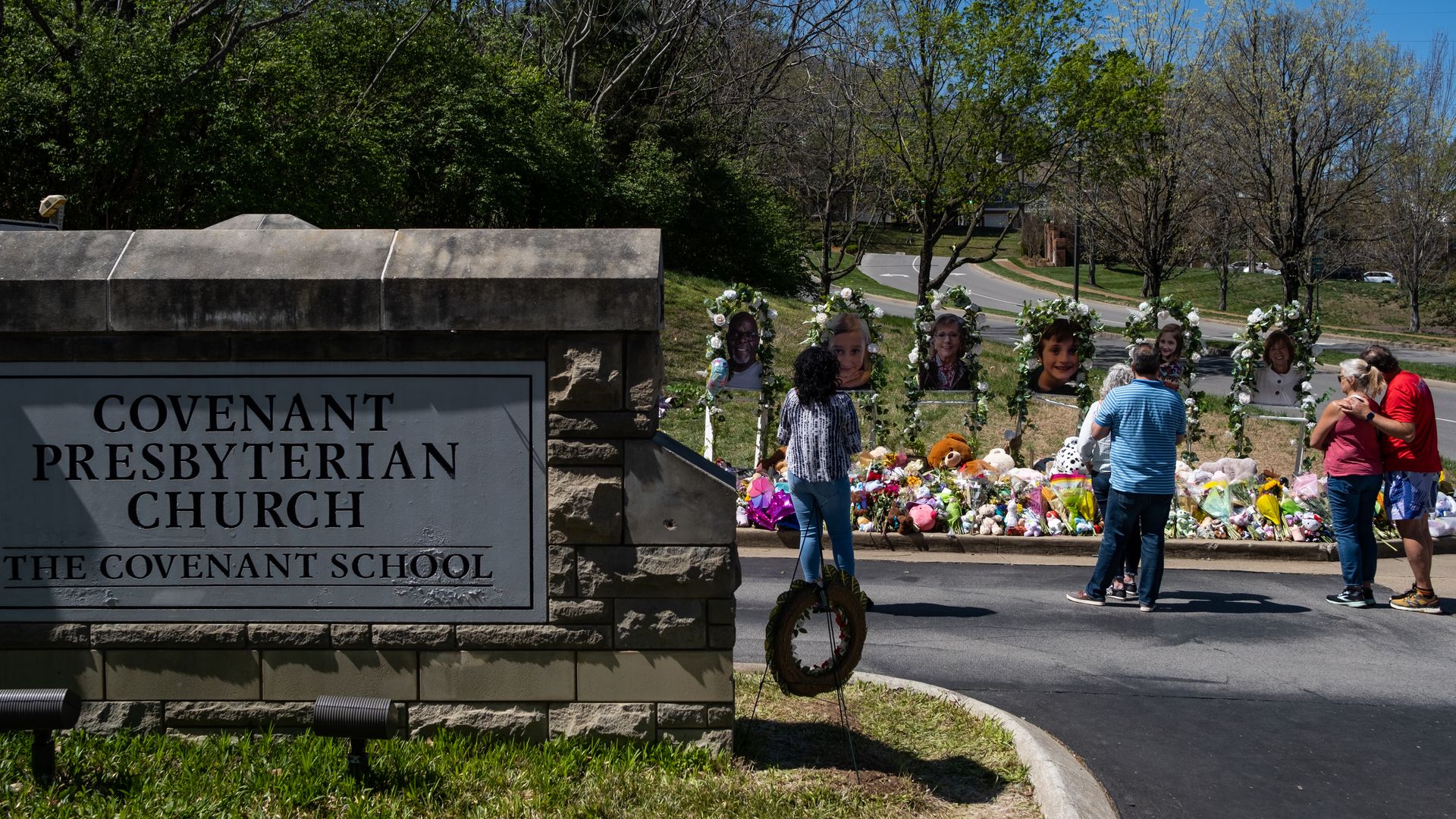 People visit a makeshift memorial at The Covenant School in April. Photo: Seth Herald/Getty Images