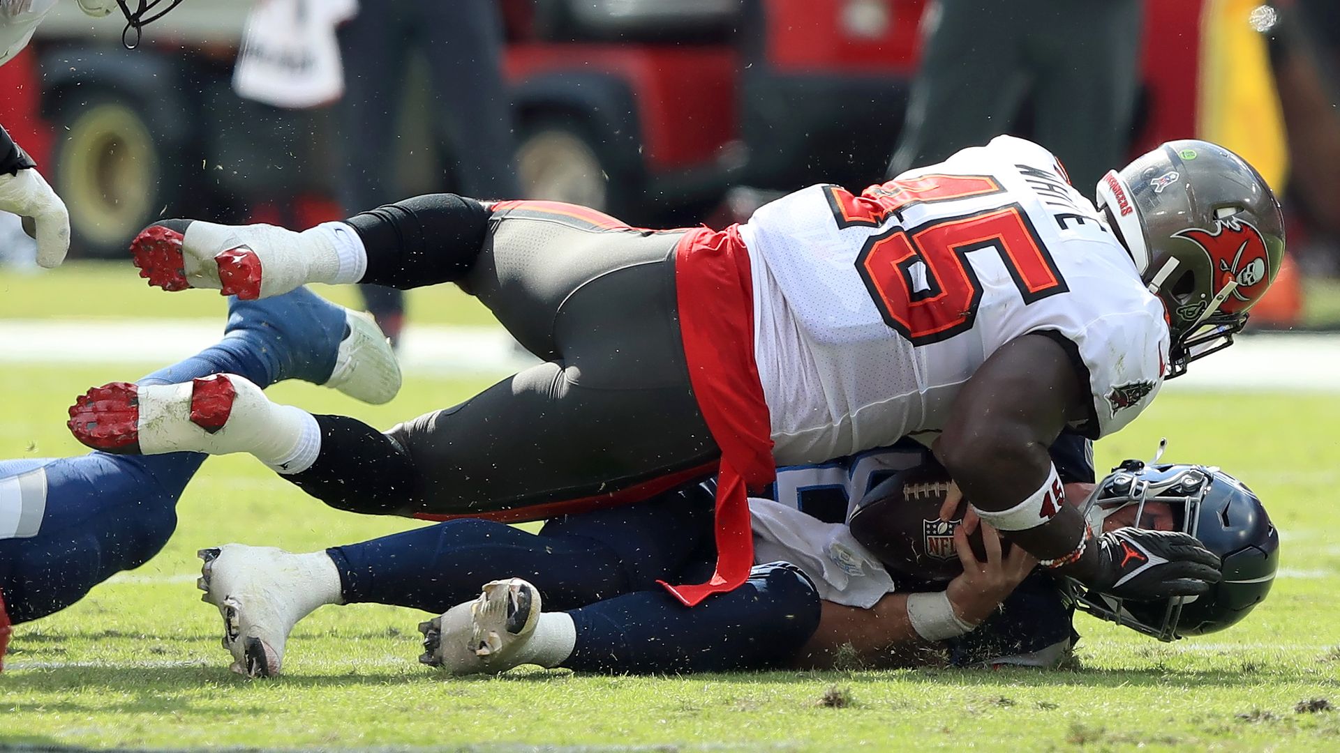 Will Levis gets clobbered during last week's game against the Buccaneers. Photo: Cliff Welch/Icon Sportswire via Getty Images