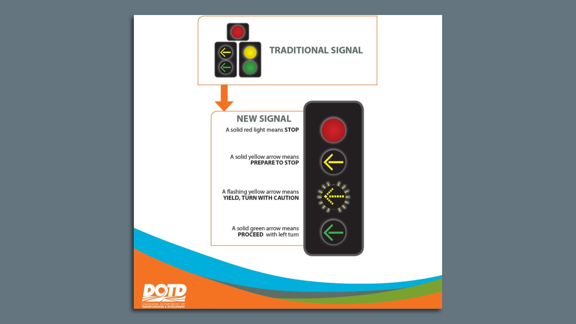 New traffic signals with flashing yellow arrows are being installed across Louisiana to meet federal standards. Illustration: DOTD
