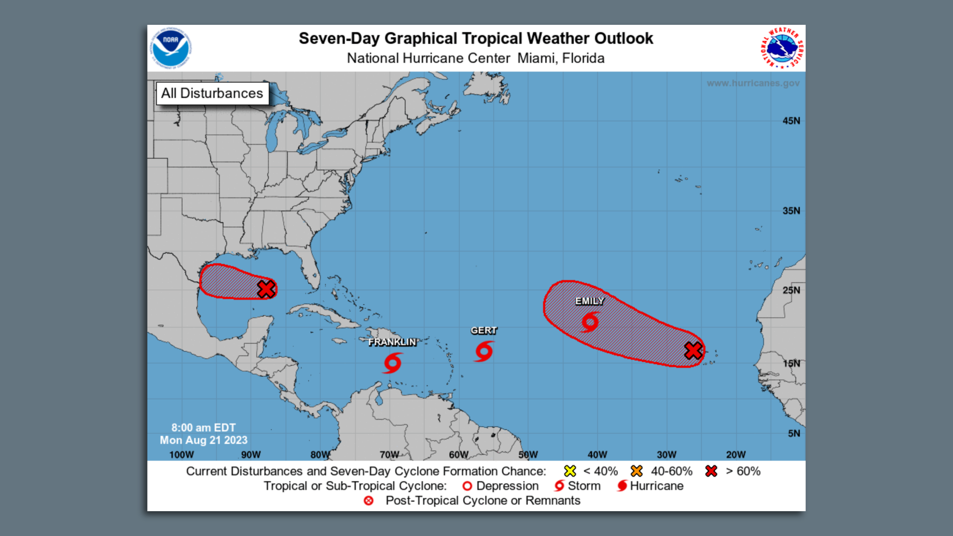 - Tropical Storm Emily is in the Atlantic and isn't a threat to land.