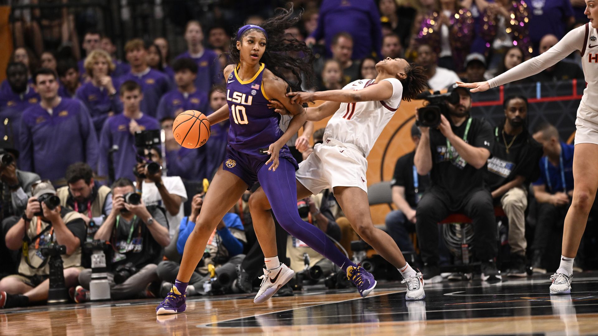 LSU Angel Reese plays in the NCAA Semifinals vs. Virginia Tech at American Airlines Arena in Dallas in March 2023. Photo: Greg Nelson /Sports Illustrated via Getty Images