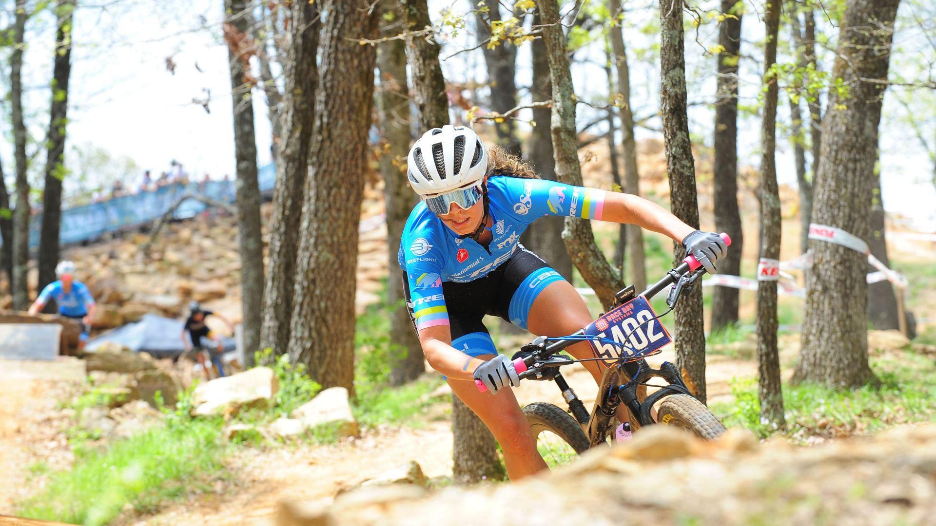 A pro elite woman races at Centennial Park on Saturday. Photo: Worth Sparkman/Axios