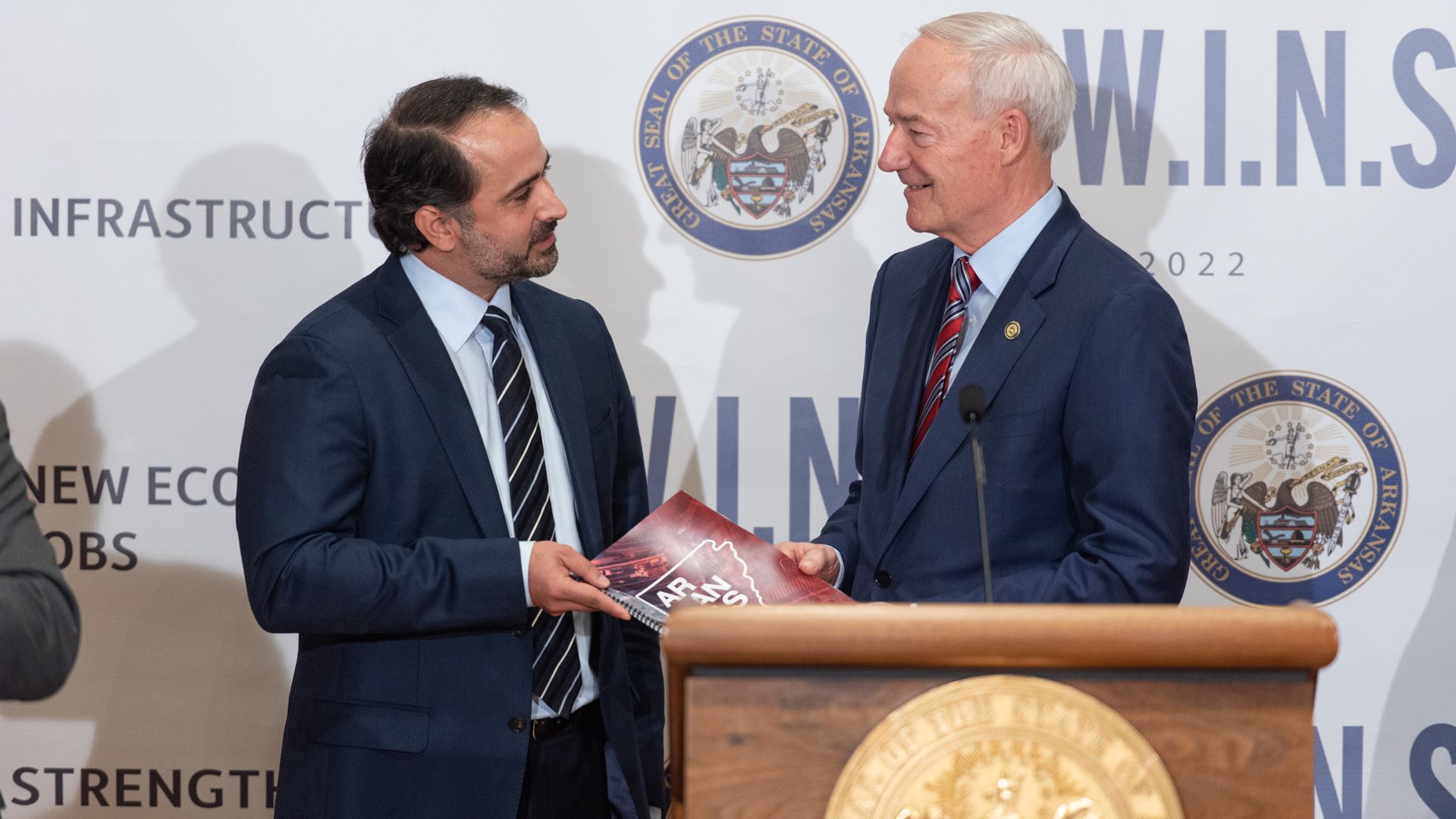 Chair of the Arkansas Council on Future Mobility, Cyrus Sigari, hands the final report to Gov. Asa Hutchinson. Photo: Courtesy the office of Gov. Hutchinson