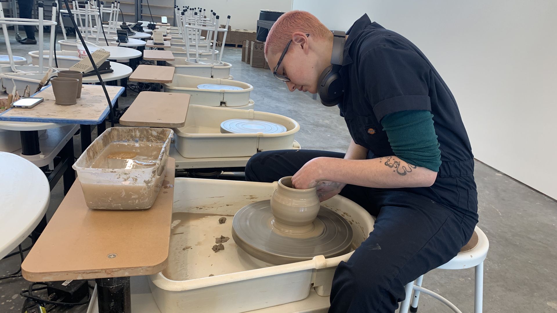 Ceramics student Beckett Chomyn works at the new art center on Feb. 3. Photo: Alex Golden/Axios