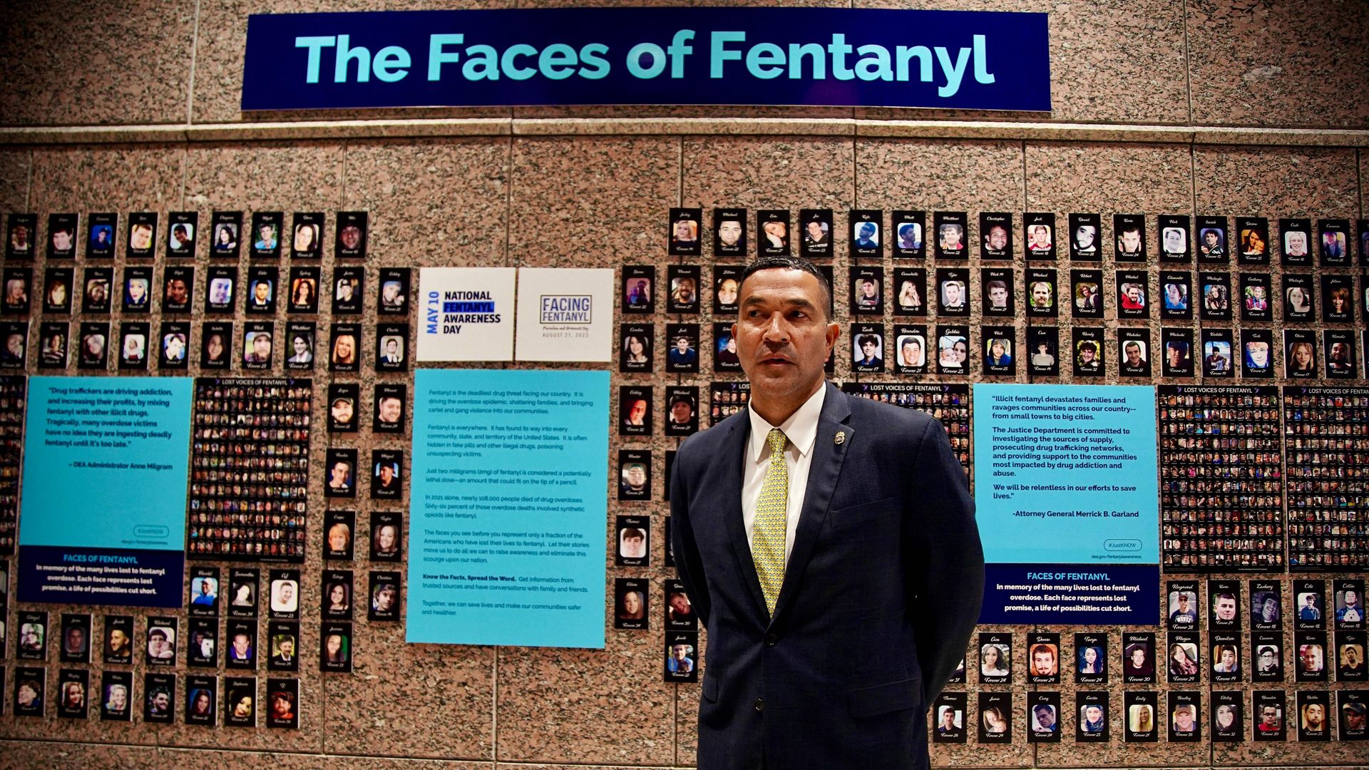 Ray Donovan, chief of operations of the Drug Enforcement Administration , stands in front of "The Faces of Fentanyl" wall, which displays photos of Americans who died of a fentanyl overdose, at the DEA headquarters in Arlington, Virginia, on July 13, 2022. Photo: Agnes BUN / AFP