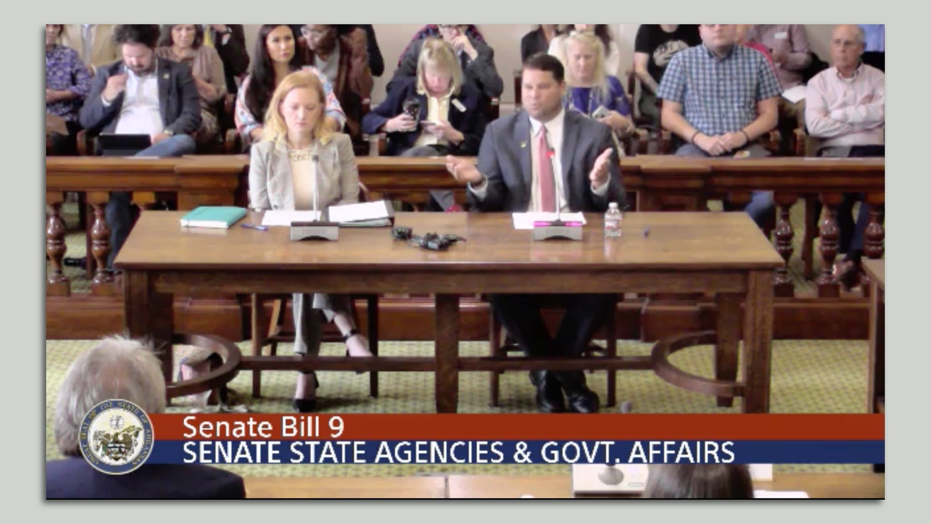 Cortney Kennedy, interim chief legal counsel of the governor's office, and Sen. Bart Hester (R-Cave Springs) speak Tuesday on behalf of SB9.