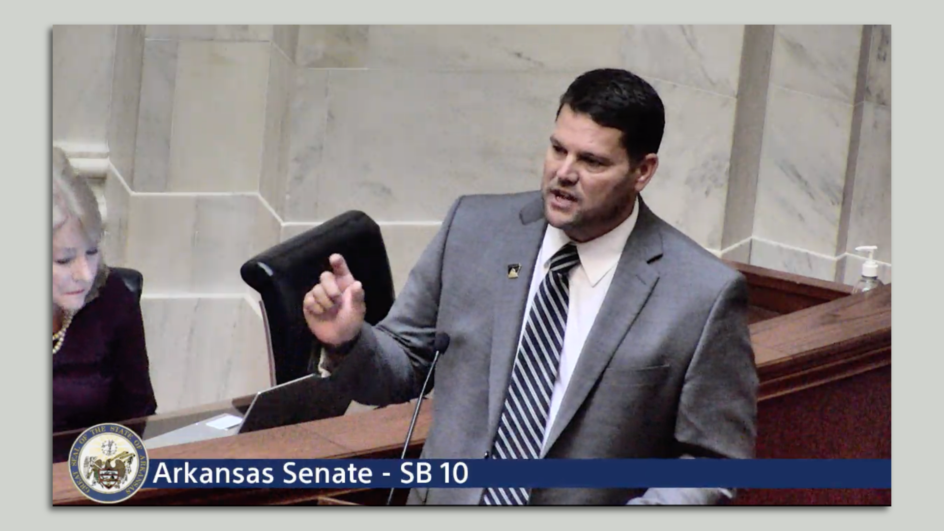 Sen. Bart Hester (R-Cave Springs) speaks for Senate Bill 10. Screenshot: Arkansas State Legislature