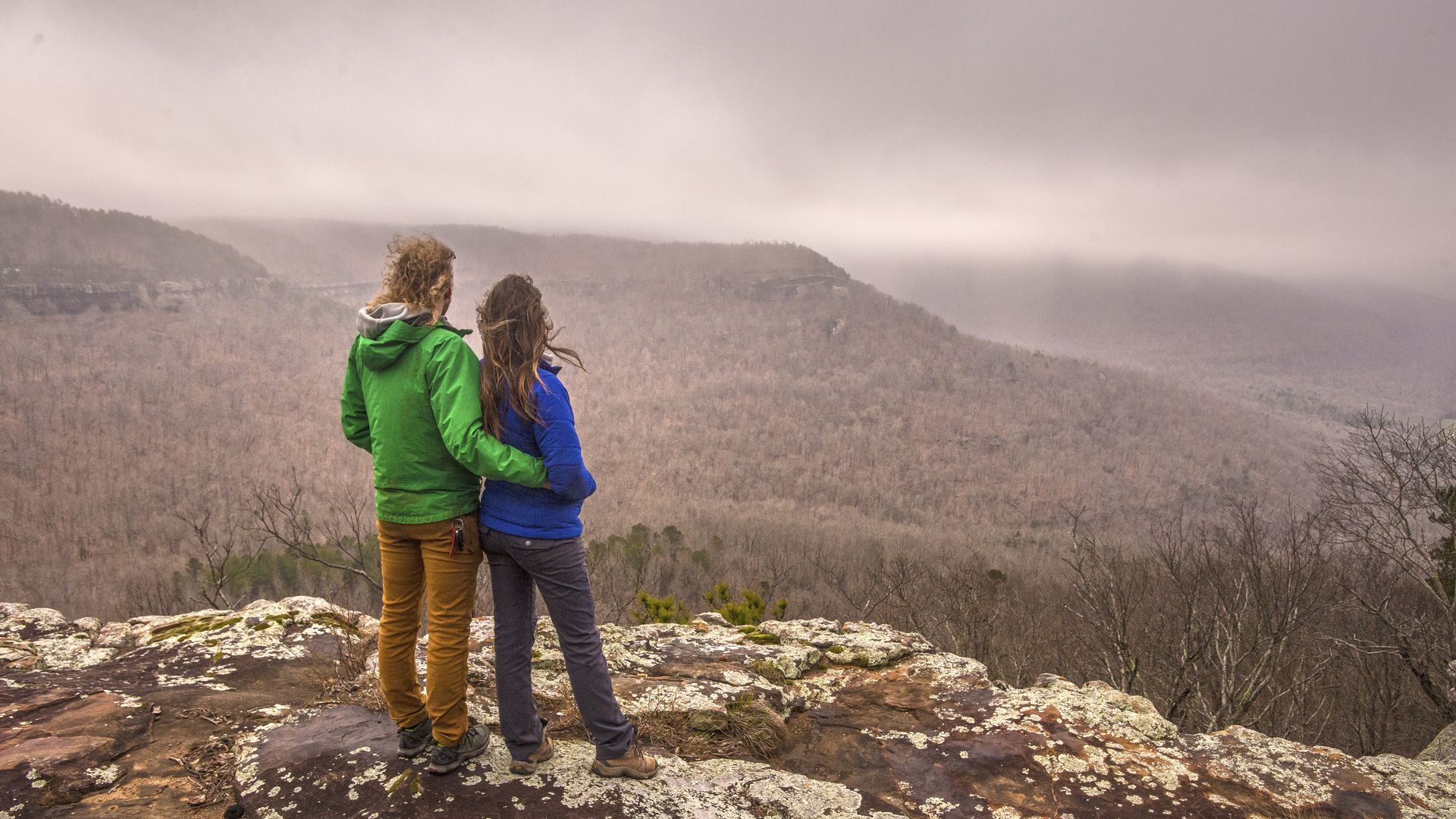 A couple look out from Sam's Throne in Newton County during wintertime. Photo courtesy of the Arkansas Department of Parks, Heritage and Tourism.