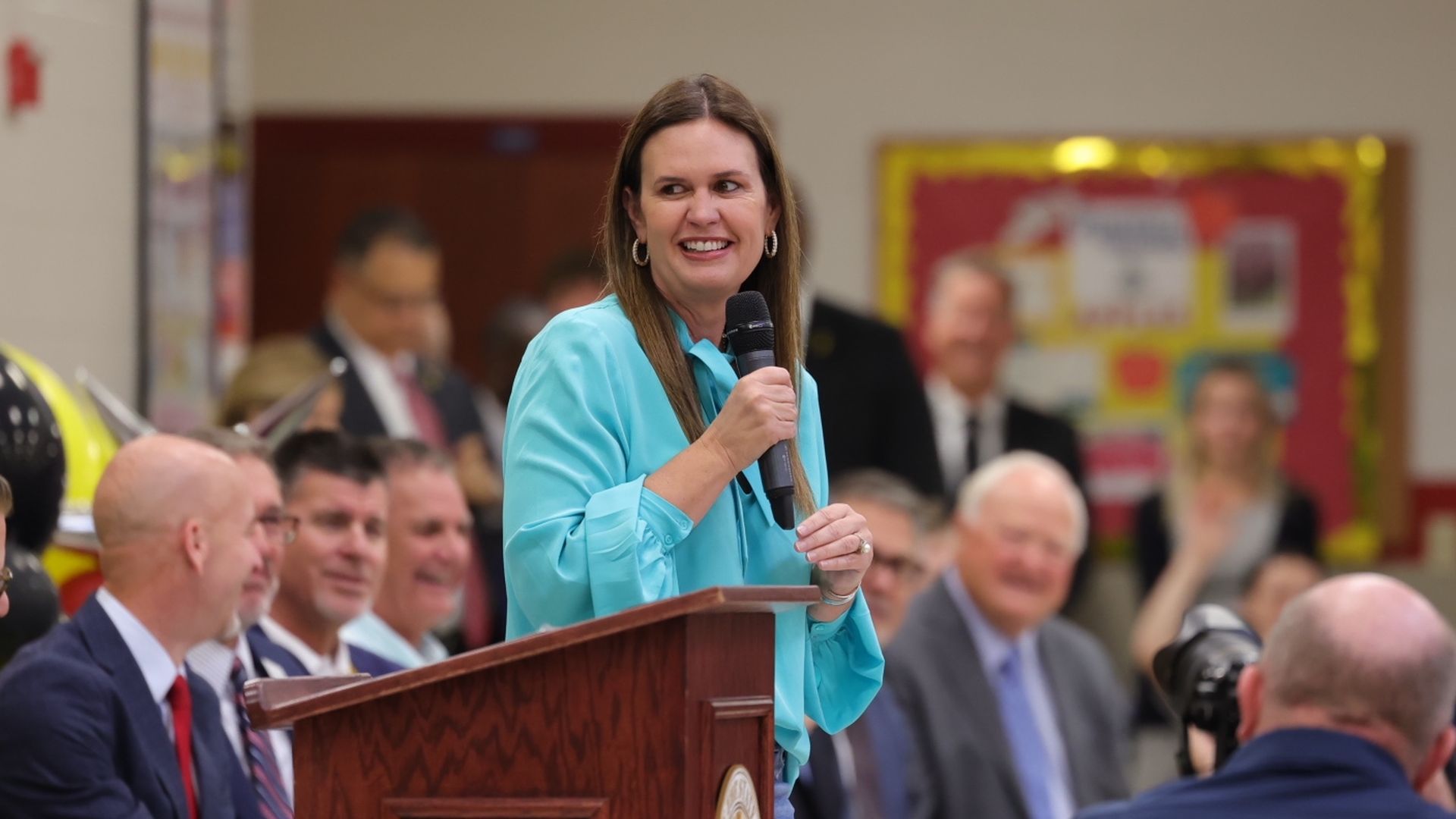 Gov. Sarah Huckabee Sanders speaks at Springdale's Hellstern Middle School in October. Photo: Worth Sparkman/Axios