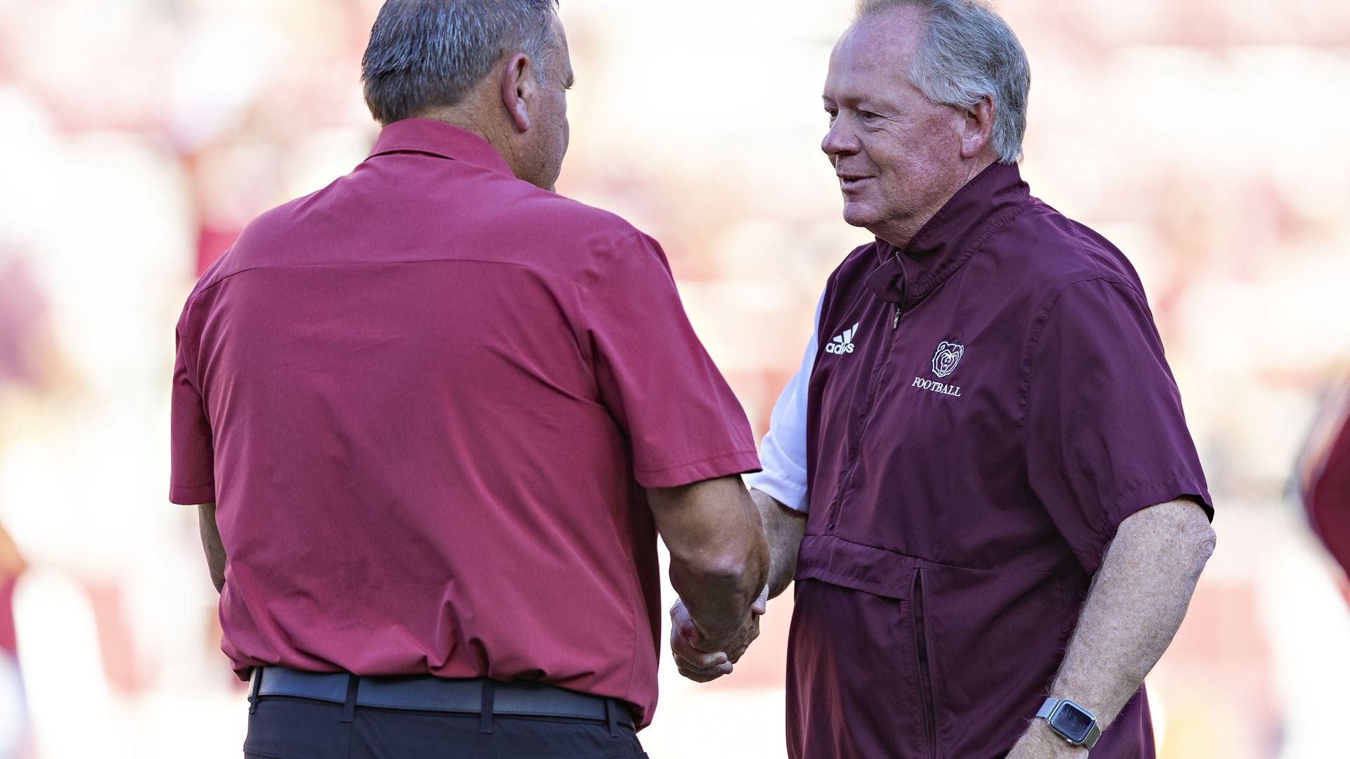 Bobby Petrino (right) greets Arkansas head football coach Sam Pittman at Donald W. Reynolds Razorback Stadium on Sept. 17, 2022, in Fayetteville. Photo: Wesley Hitt/Getty Images