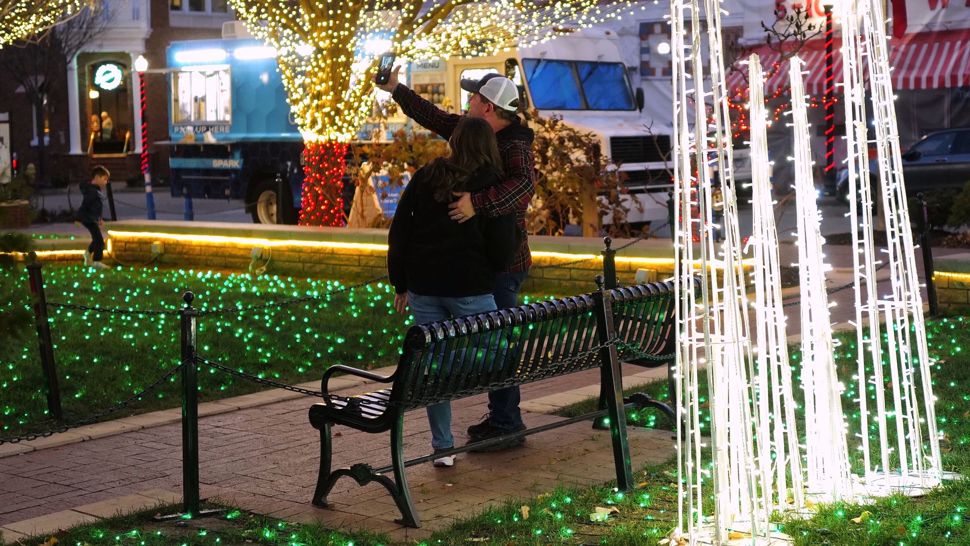 A couple stops for a selfie at the Bentonville Square. Photo: Worth Sparkman/Axios