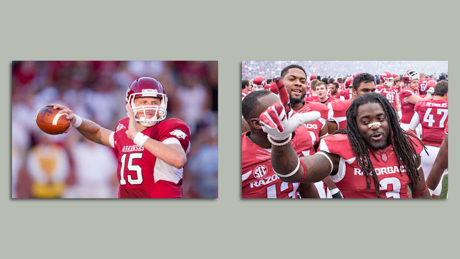 Ryan Mallett (left) in 2010 and Alex Collins in 2015. Photos: Wesley Hitt/Getty Images