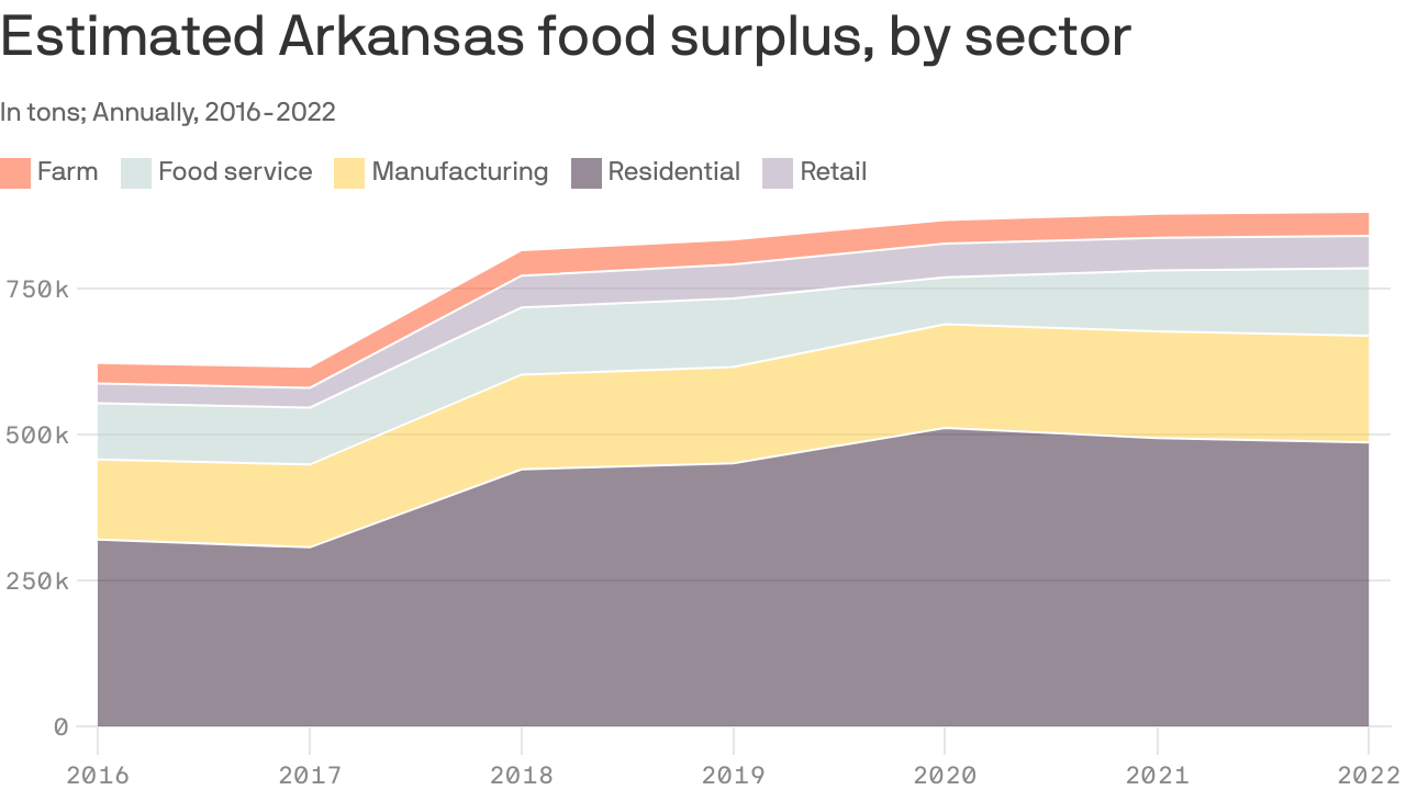 Consumers and businesses in Arkansas produced more than 880,000 tons of surplus food in 2022, nearly a 42% increase from 2016, per data from the nonprofit ReFED.