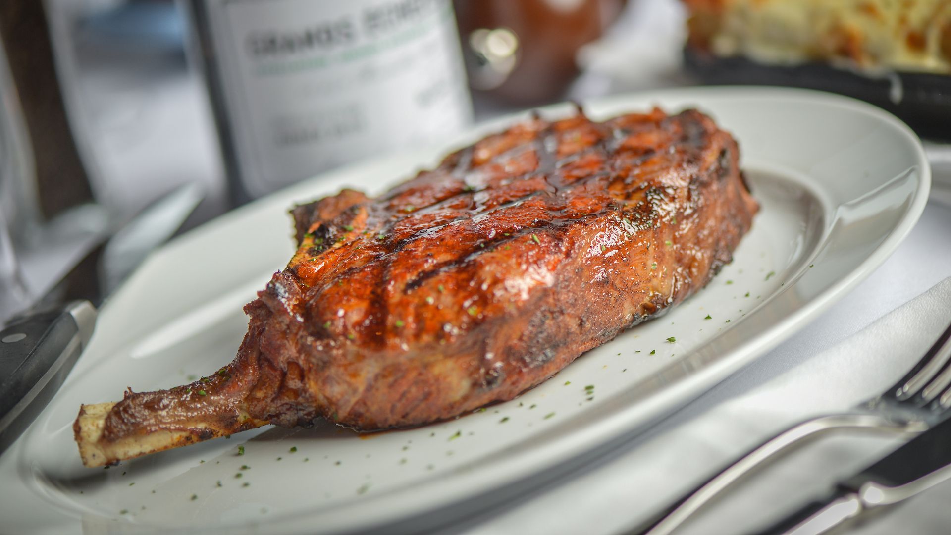 A ribeye steak and a bottle of wine at Steak 48 in Philadelphia. Photo courtesy of Steak 48