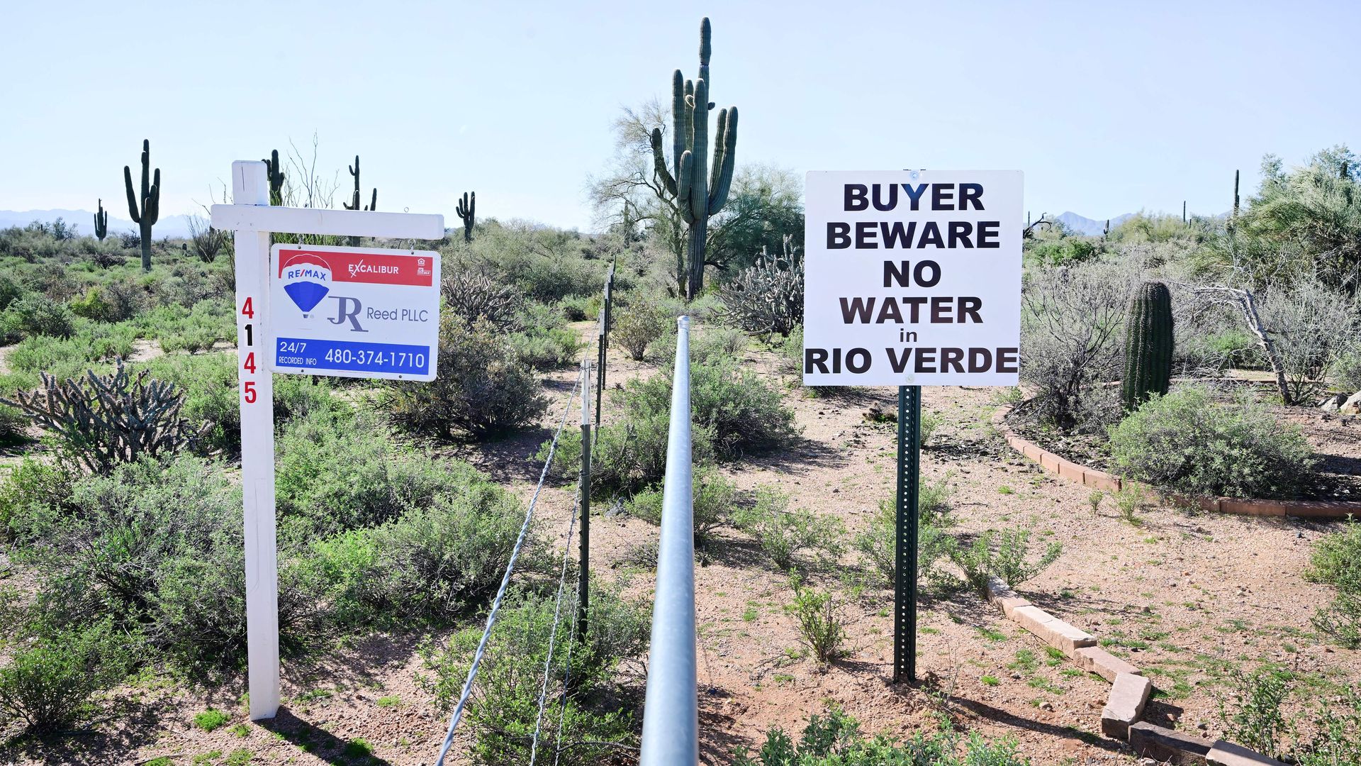 A sign warning buyers of the water situation is displayed across from a property for sale in Rio Verde Foothills on Feb. 24. Photo: Frederic J. BROWN / AFP via Getty Images