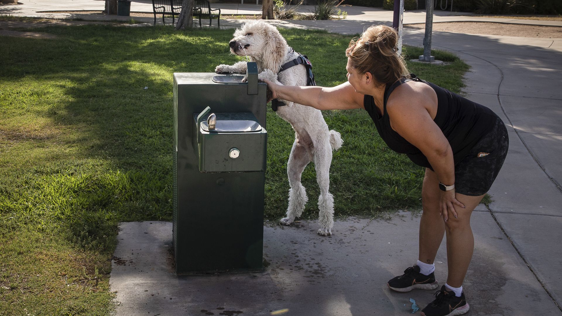 Wanesia Misquadace helps ItzaPoo drinks from a Pecos Park water fountain in July. Photo: Caitlin O'Hara for The Washington Post via Getty Images