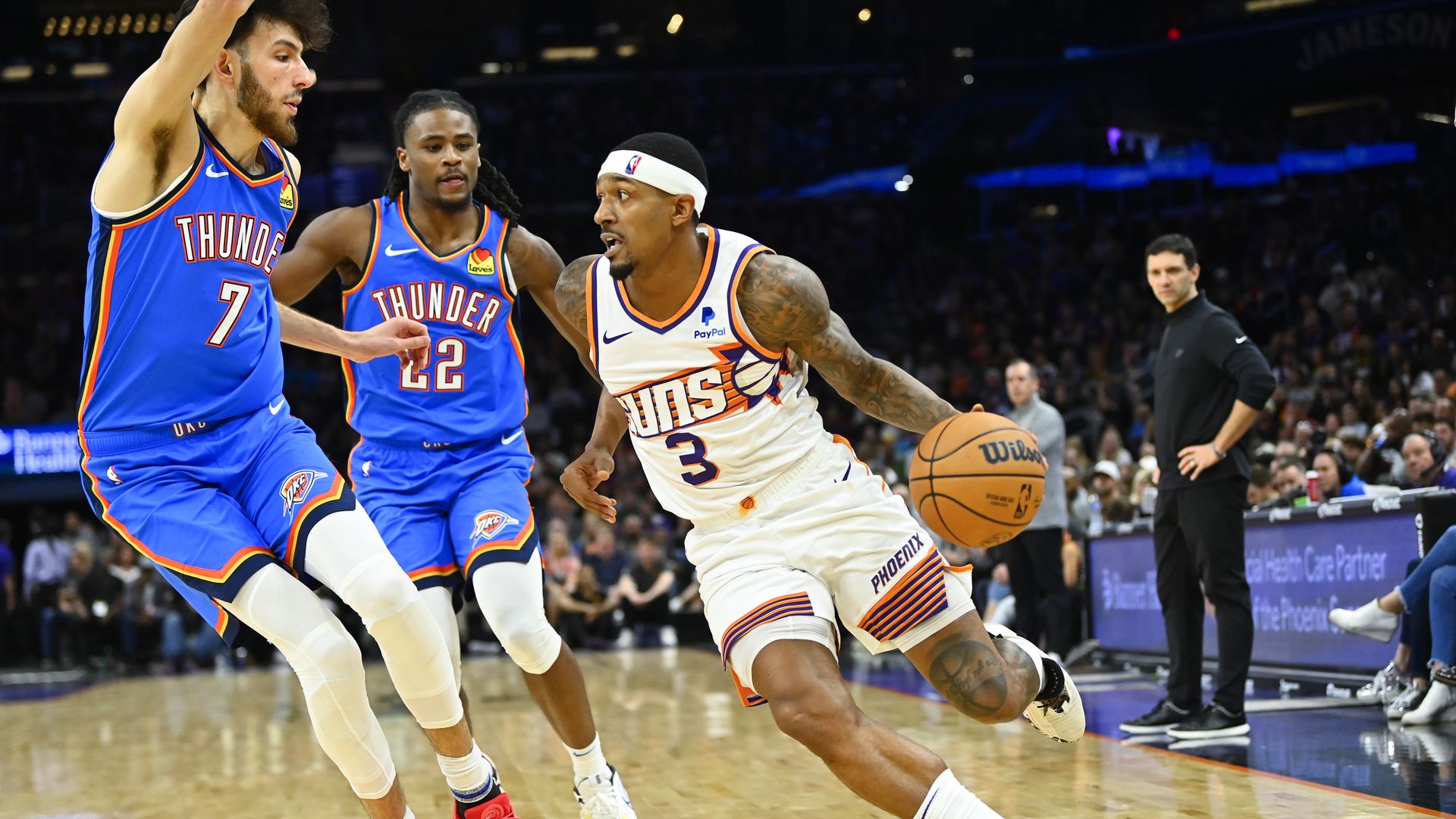 The Suns' Bradley Beal drives against Chet Holmgren and Cason Wallace of the Oklahoma City Thunder on Monday. Photo: Kelsey Grant/Getty Images