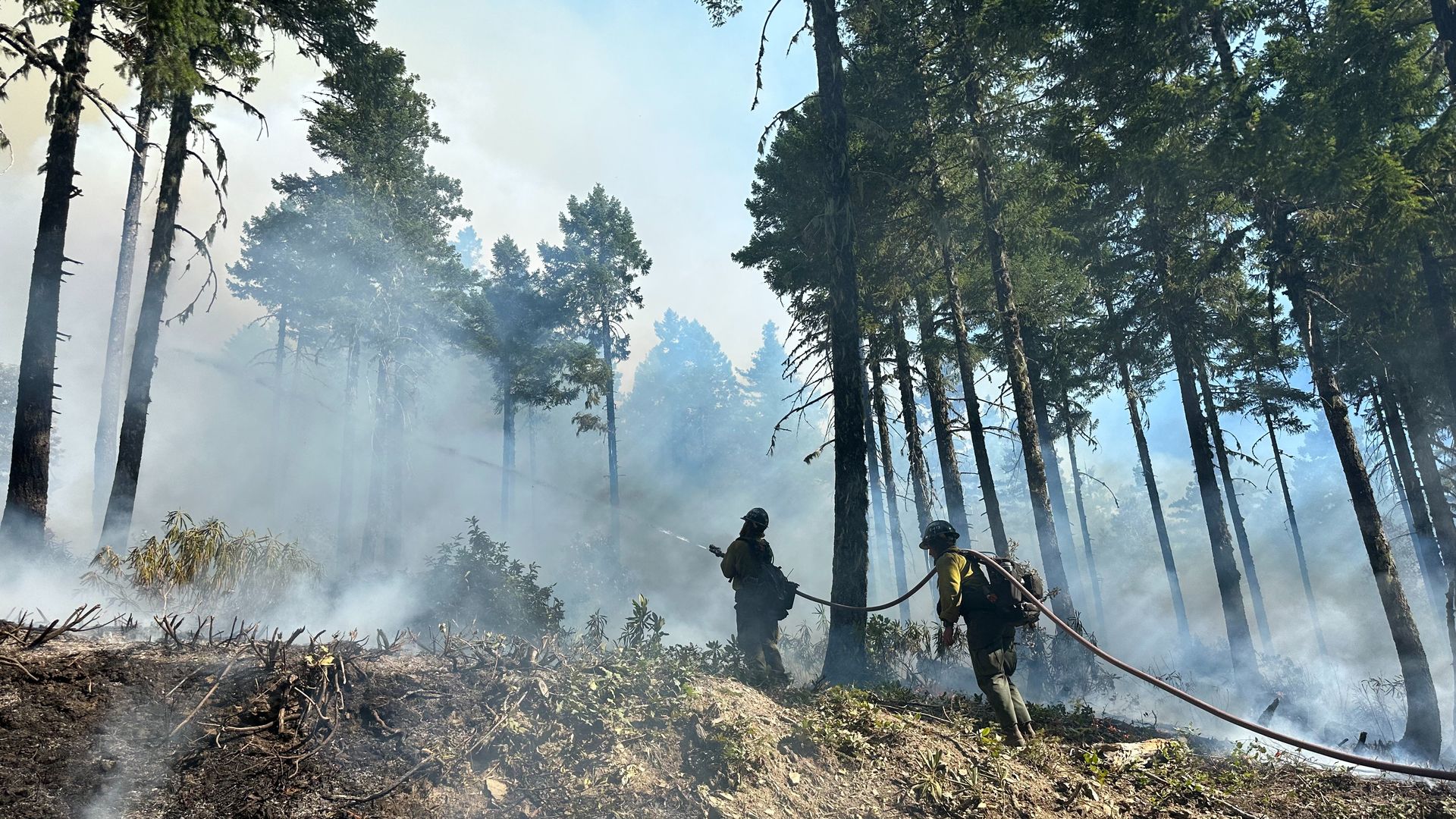Two hotshot firefighters battle the Flat fire in the Siskiyou National Forest in July. Photo courtesy of Flat Fire Incident Information.