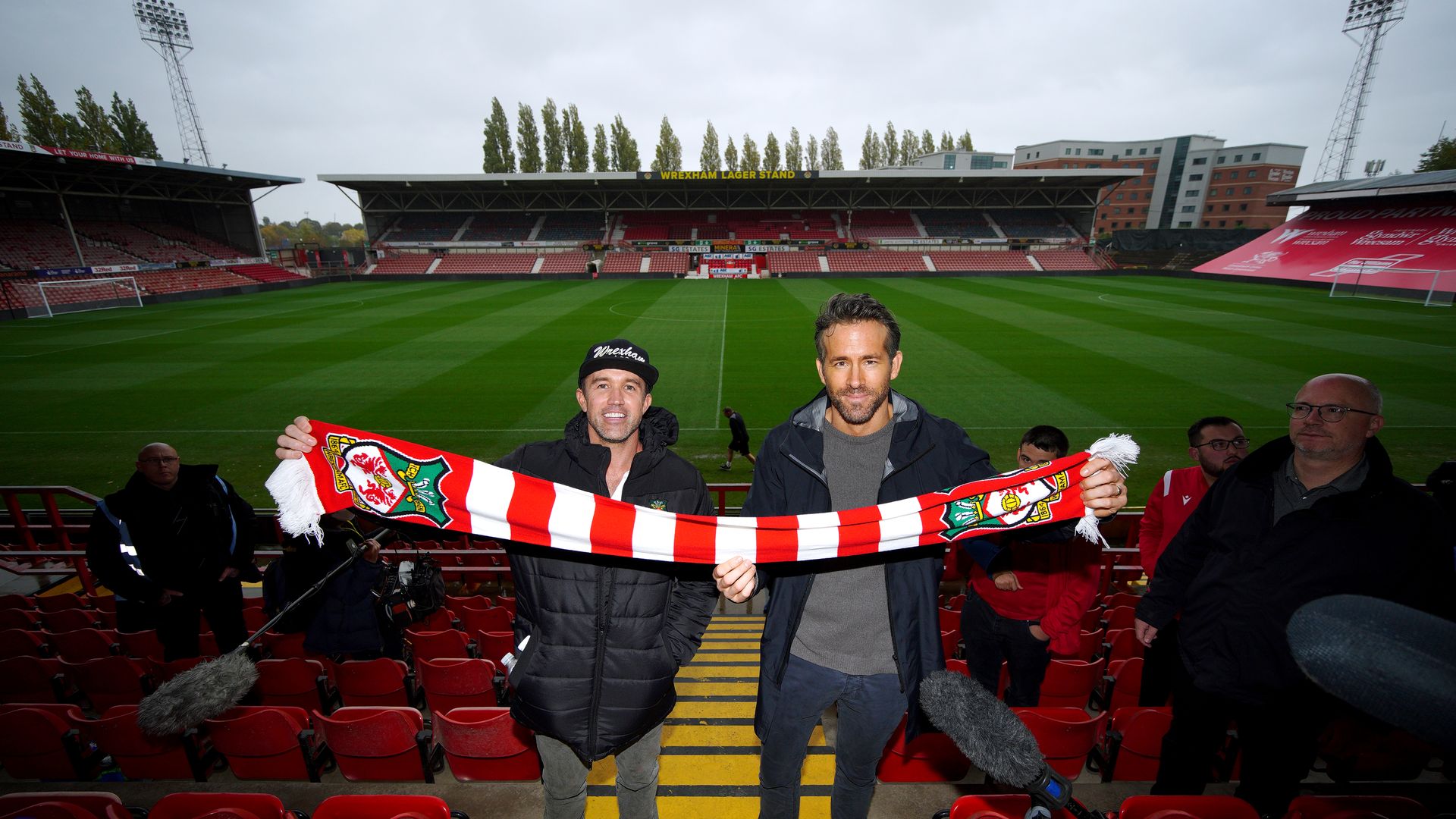 Wrexham co-chairmen Rob McElhenney (left) and Ryan Reynolds during a press conference at the Racecourse Ground, Wrexham. Photo: Peter Byrne/PA Images via Getty Images