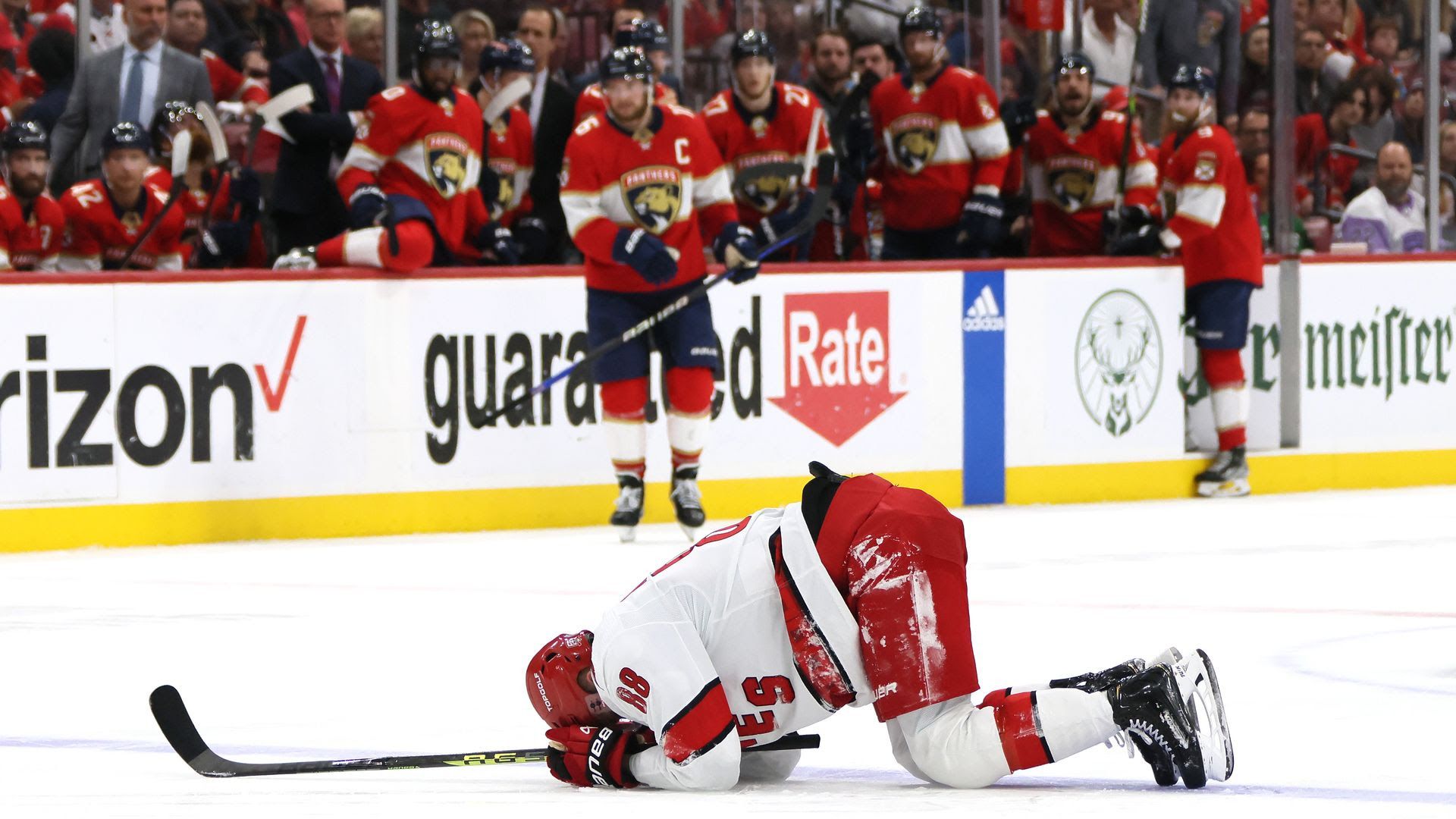 Martin Necas, #88 of the Carolina Hurricanes, lays on the ice after a play against the Florida Panthers during the second period in Game Four of the Eastern Conference Final of the 2023 Stanley Cup Playoffs. Photo: Bruce Bennett/Getty Images