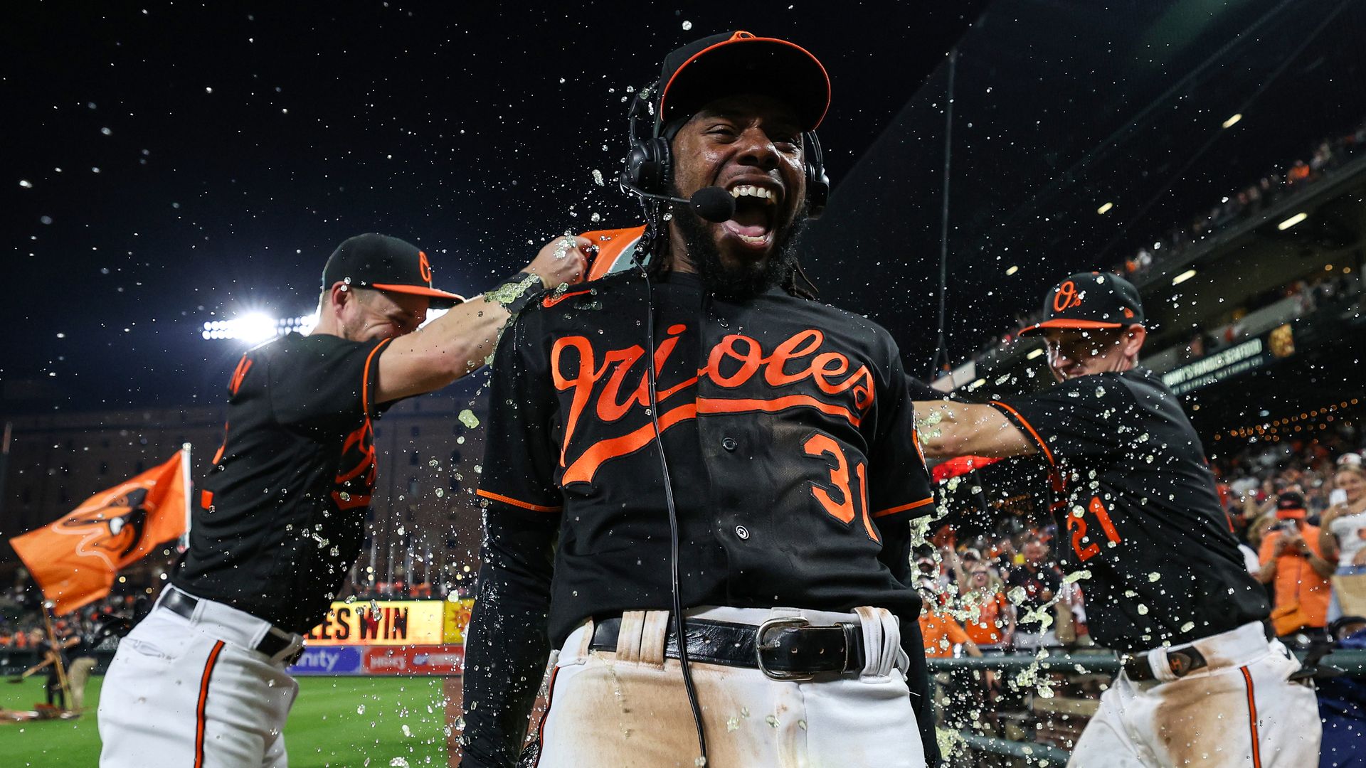 Cedric Mullins gets a Gatorade bath from his teammates after hitting for the cycle against the Pirates on May 12. Photo: Patrick Smith/Getty Images