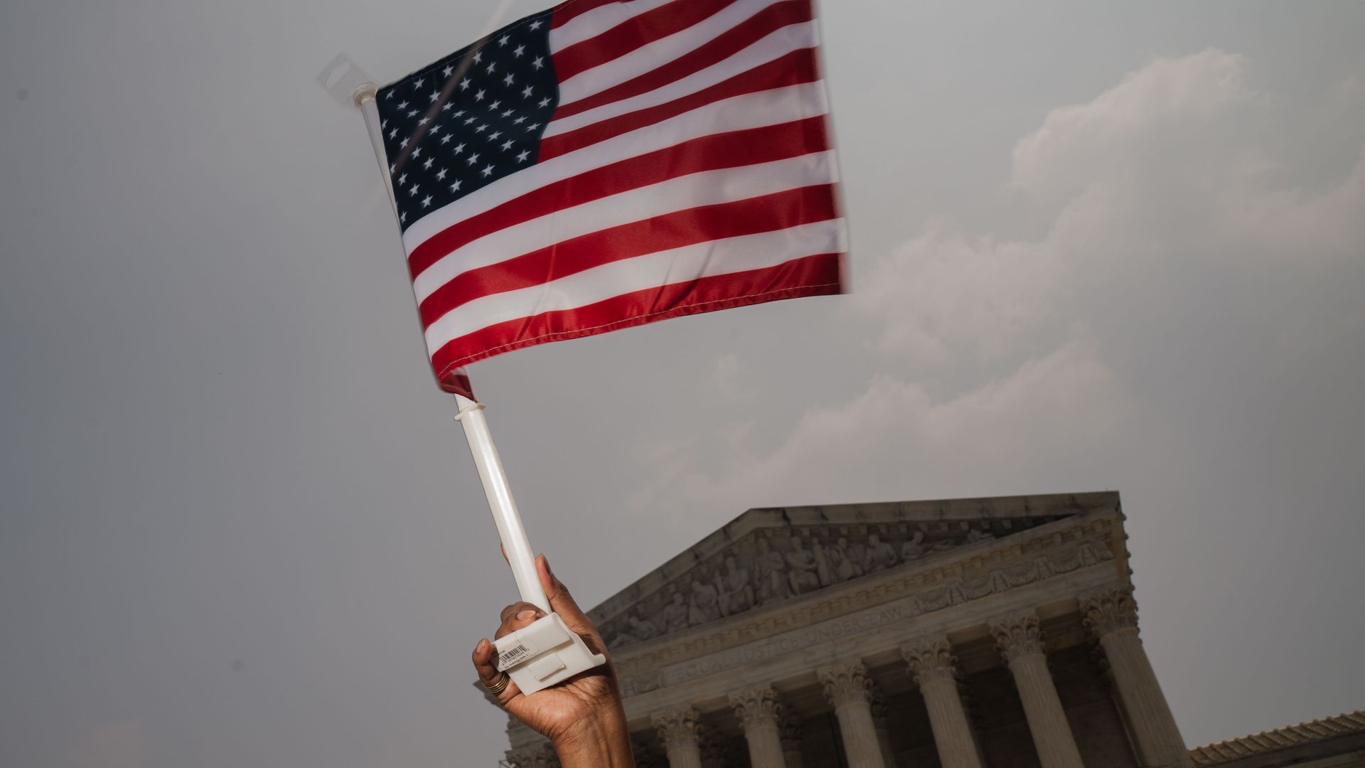 A woman holds an American flag during a rally outside of the Supreme Court of the United States after it ruled Thursday that race-conscious admissions are unconstitutional. Photo: Kent Nishimura/Los Angeles Times via Getty Images