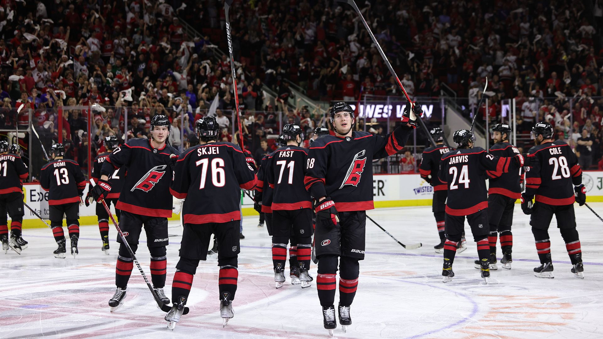 Martin Necas, of the Carolina Hurricanes, salutes the crowd after a win over the New York Rangers during the 2022 Stanley Cup Playoffs at PNC Arena. Photo: Gregg Forwerck/NHLI via Getty Images