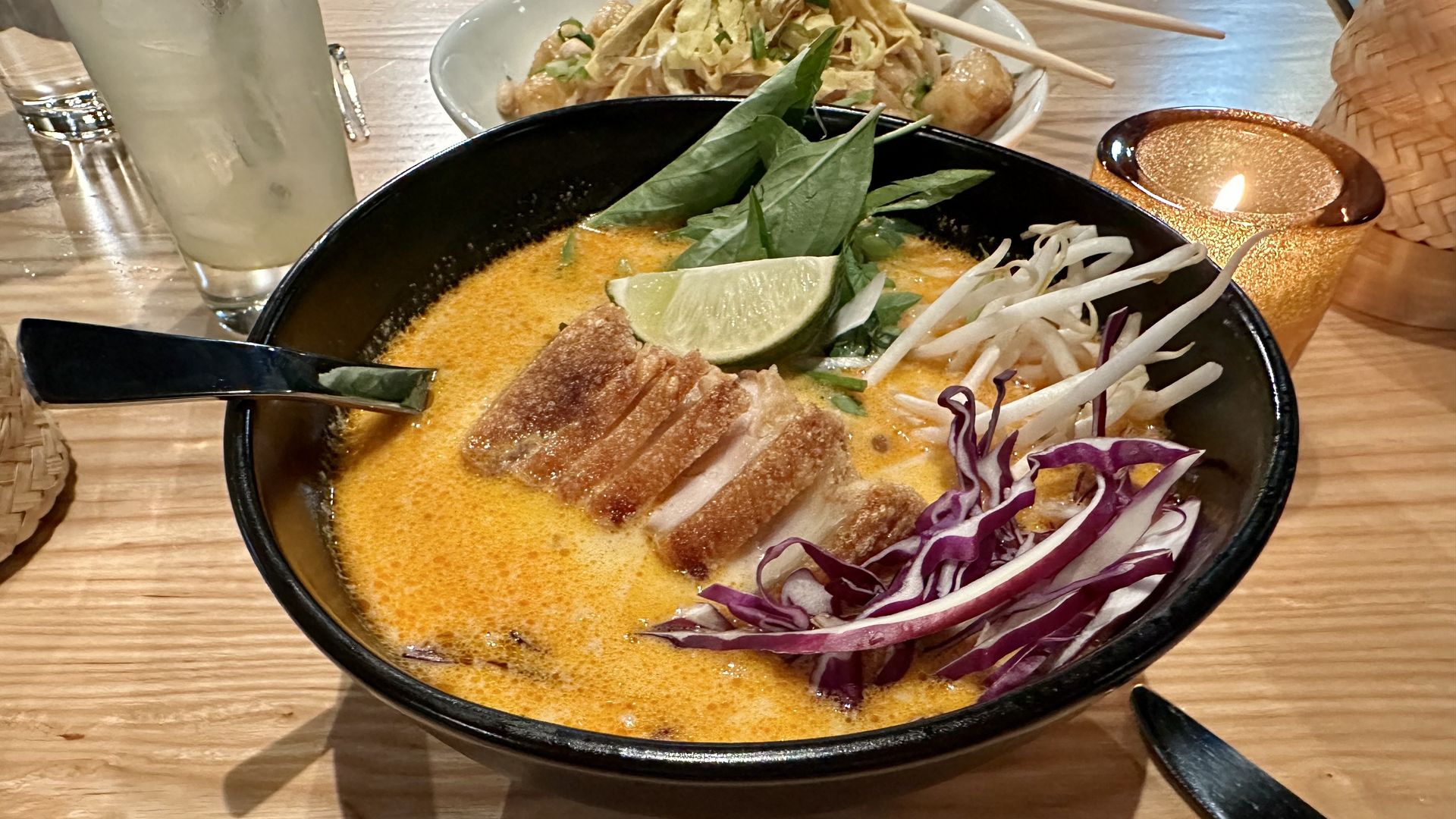 The crispy pork belly, coconut curry and egg drop soup at Saap. Photo: Zachery Eanes/Axios