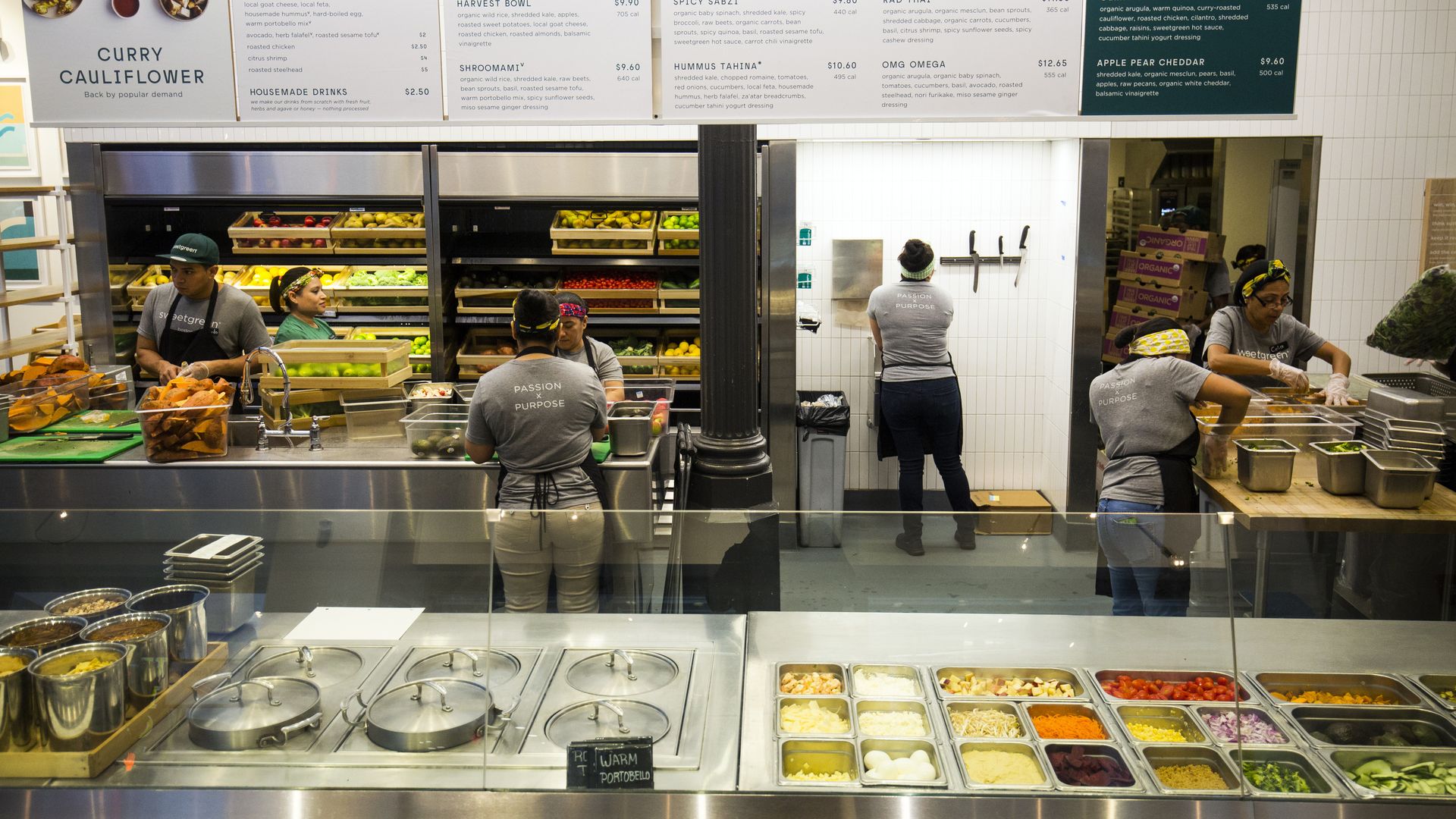 Workers prepare food inside a Sweetgreen restaurant. Photo: Adam Glanzman/Bloomberg via Getty Images