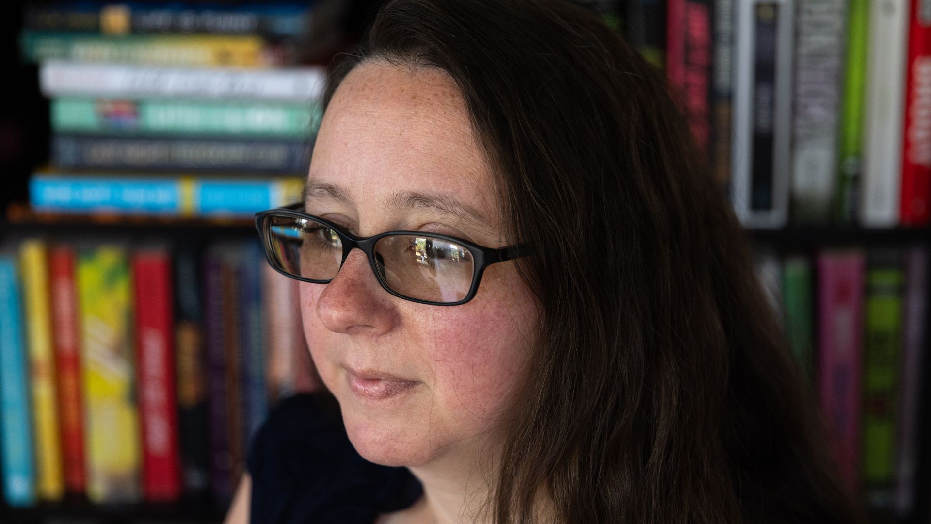 Jennifer Petersen poses in front of books she's sought to ban. Photo: Julia Nikhinson/Washington Post via Getty Images