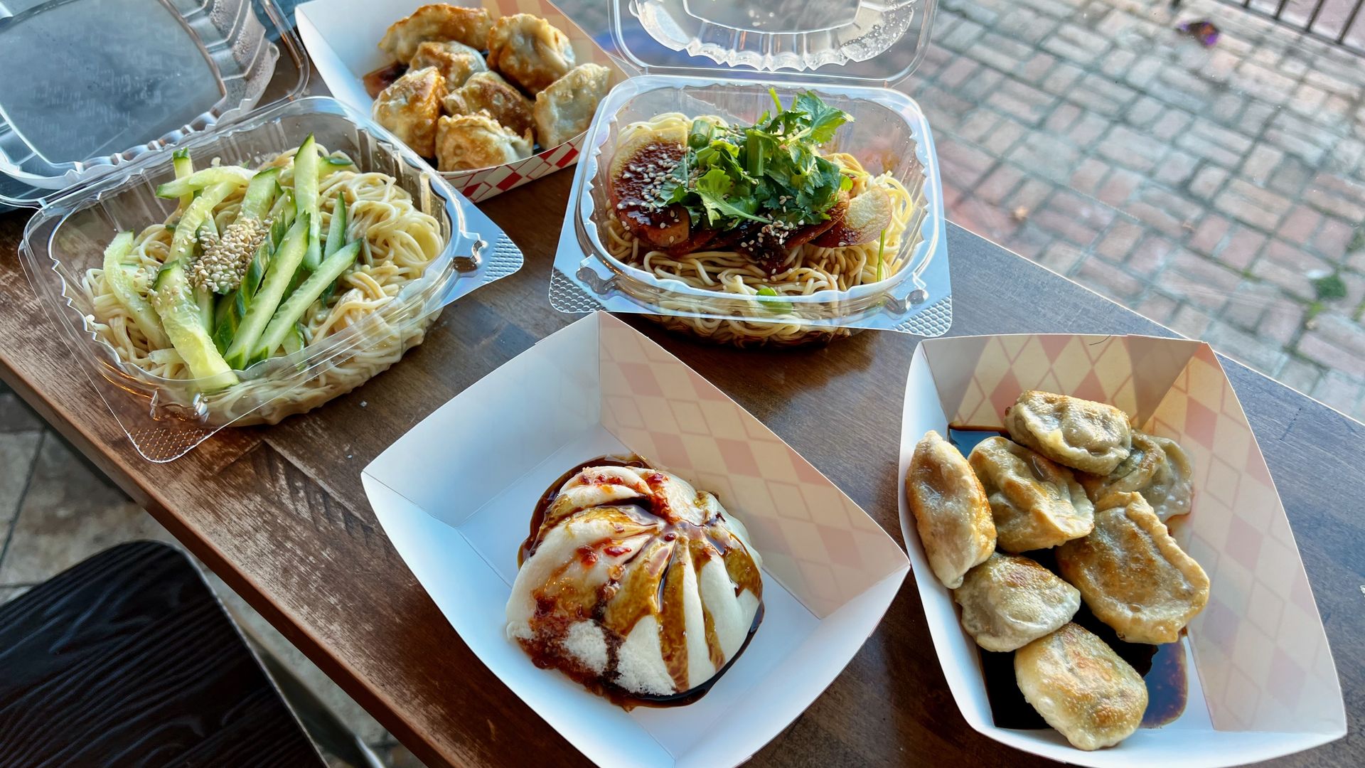 Pork and chicken dumplings, a steamed pork bun and noodles two ways. Photo: Ned Oliver/Axios