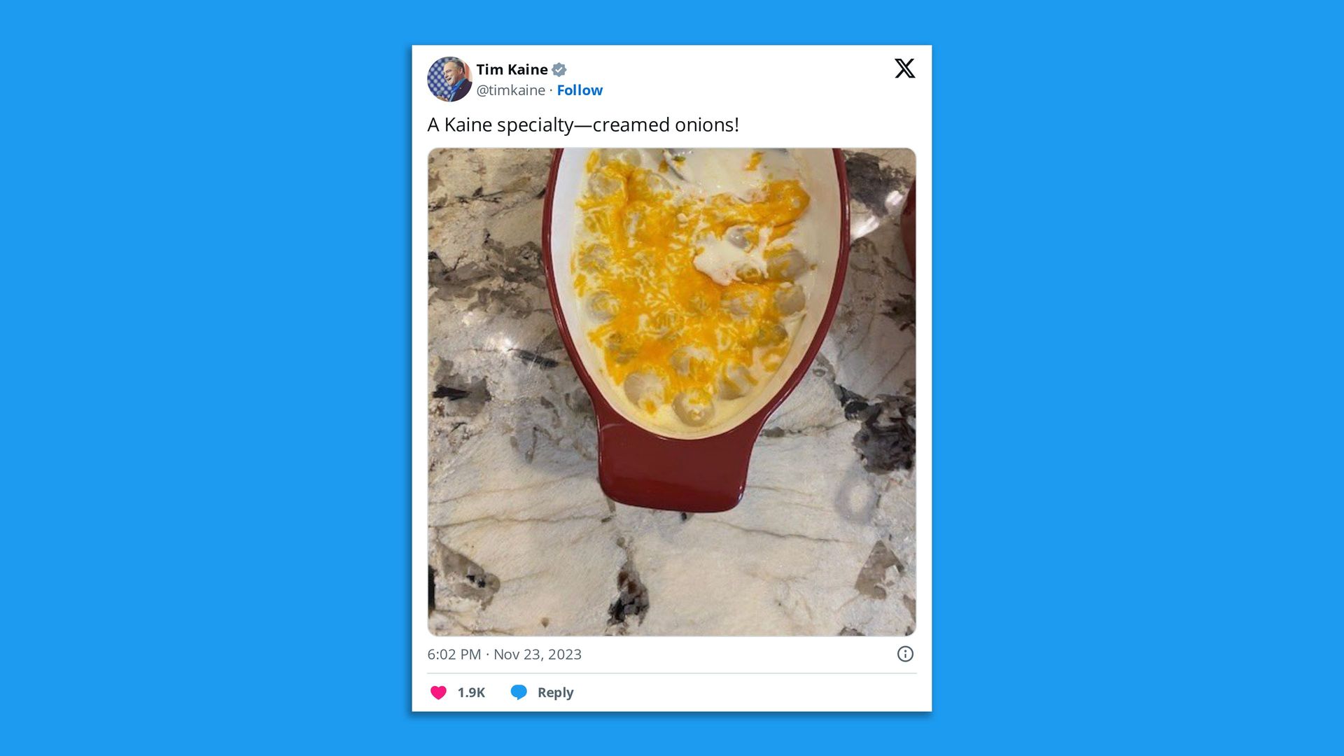 Apparently Kaine's version includes some kind of cheese. Cheddar? American? Possibly Velveeta. Image: X/@TimKaine