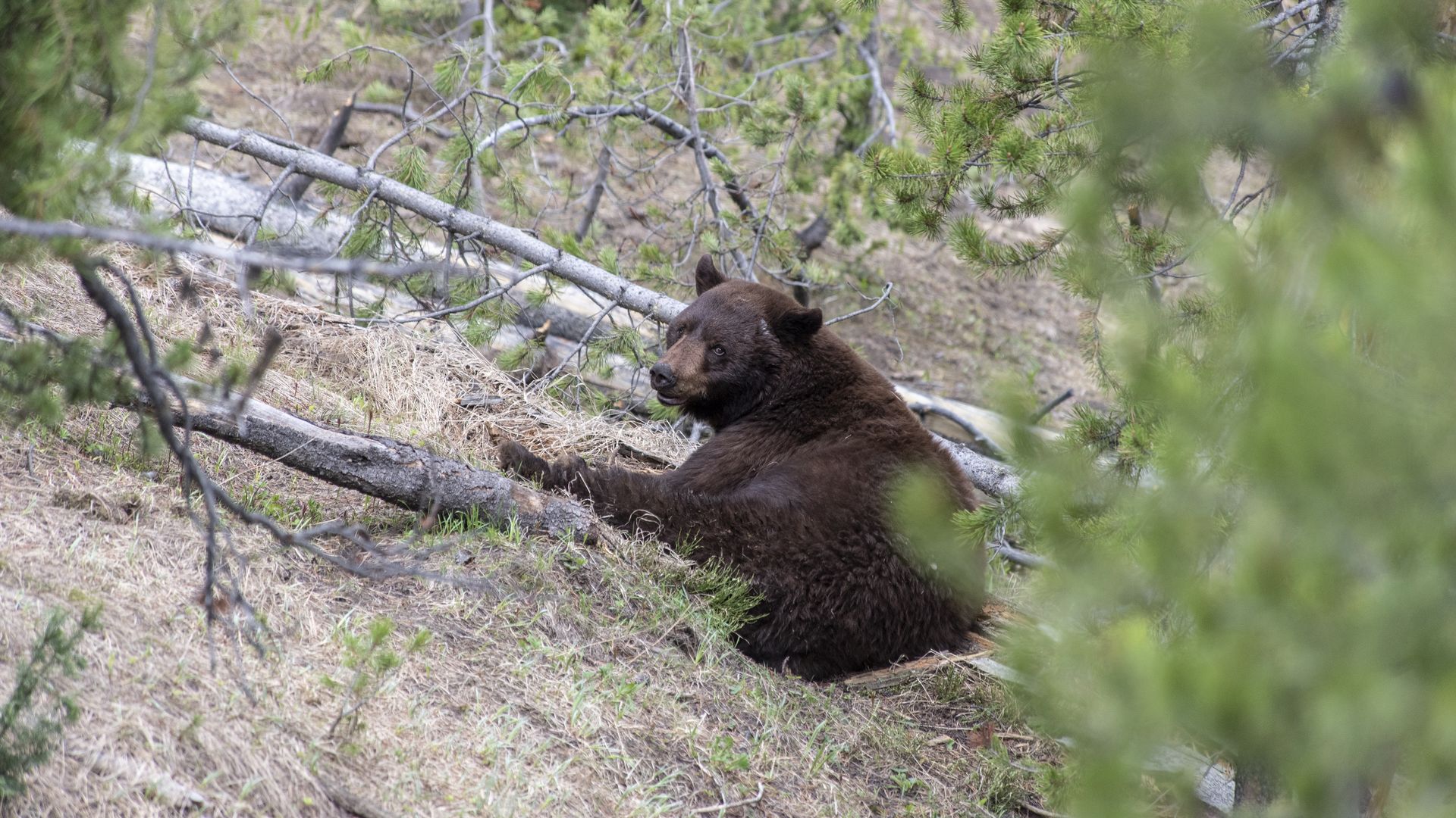A black bear rests in a mixed-age forest on June 30, 2018, in Yellowstone National Park, Wyoming. Photo: William Campbell/Corbis via Getty Images
