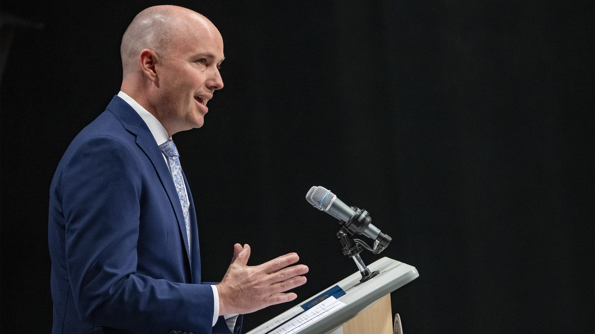 Gov. Spencer Cox answers questions during his monthly news conference at the the Eccles Broadcast Center in Salt Lake City on May 18. Photo: Rick Egan/Salt Lake Tribune/Pool