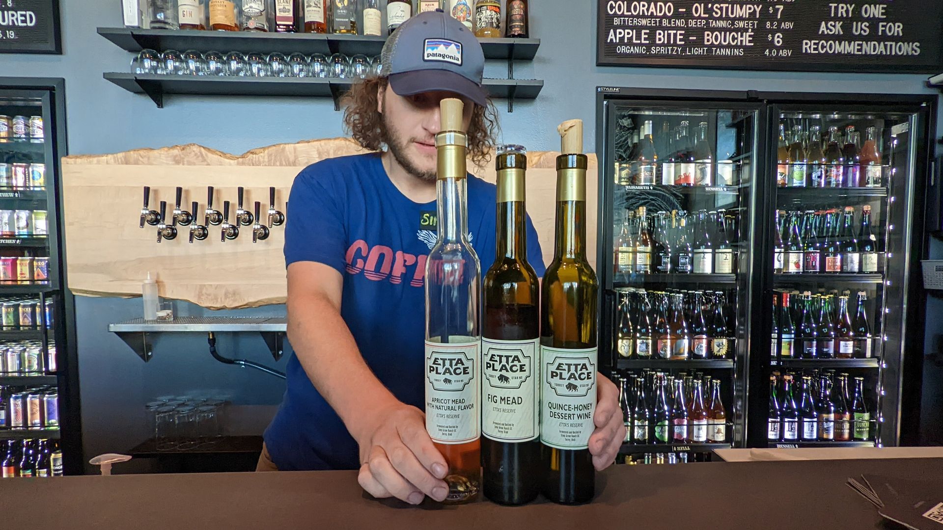 A server at Scion Cider Bar in Salt Lake lines up bottle of Etta Place mead for a tasting. Photo: Erin Alberty/Axios