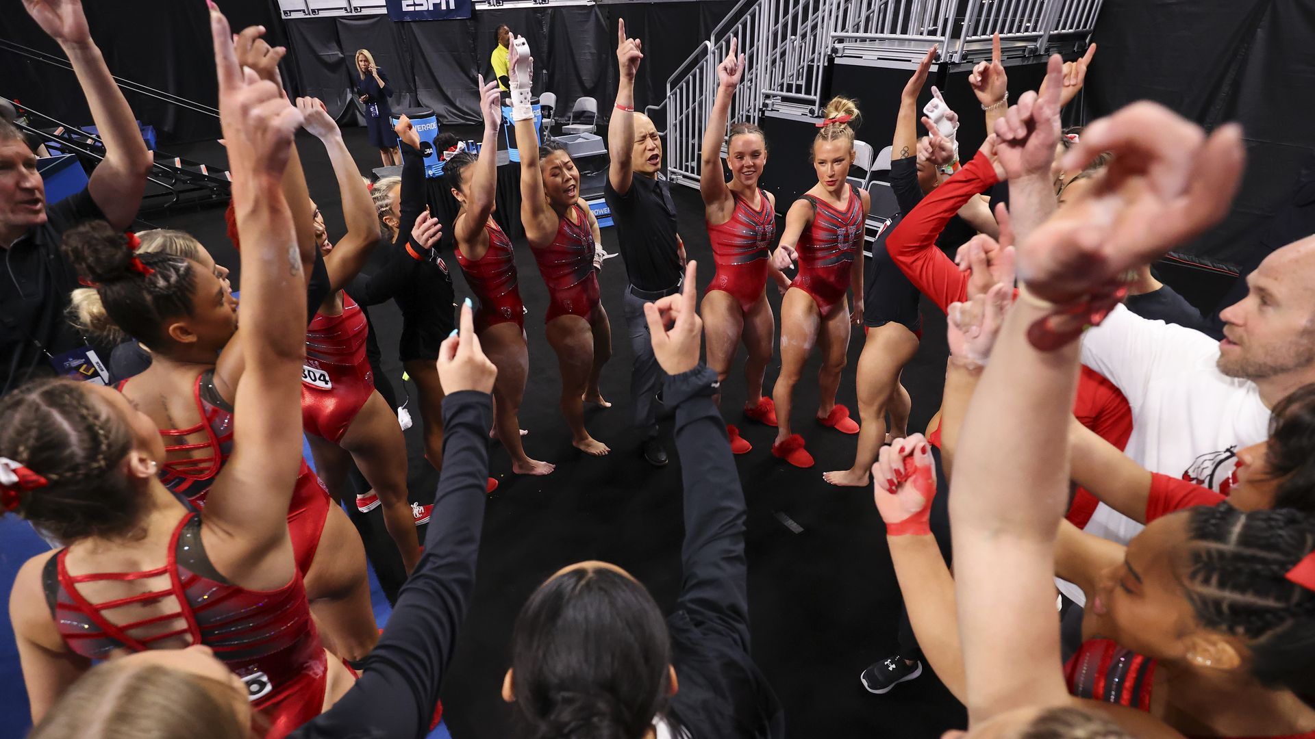 Head coach Tom Farden of the Utah Utes leads his team in a huddle during the Division I Womens Gymnastics Championship held at Dickies Arena on April 16, 2022 in Fort Worth, Texas. Photo: C. Morgan Engel/NCAA Photos via Getty Images