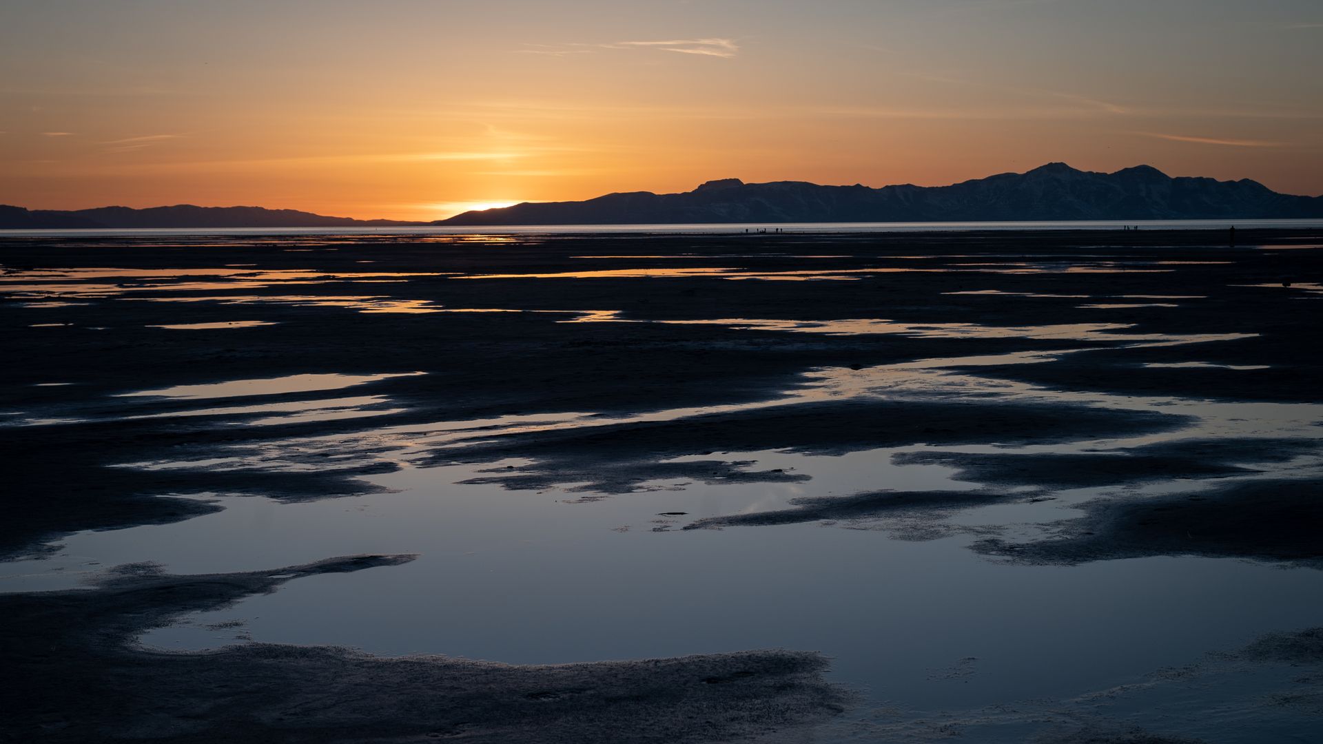 Snow and water pool up on a stretch of exposed lakebed on the southern end of the Great Salt Lake in Magna, Utah on April 6. Photo: James Roh for The Washington Post via Getty Images