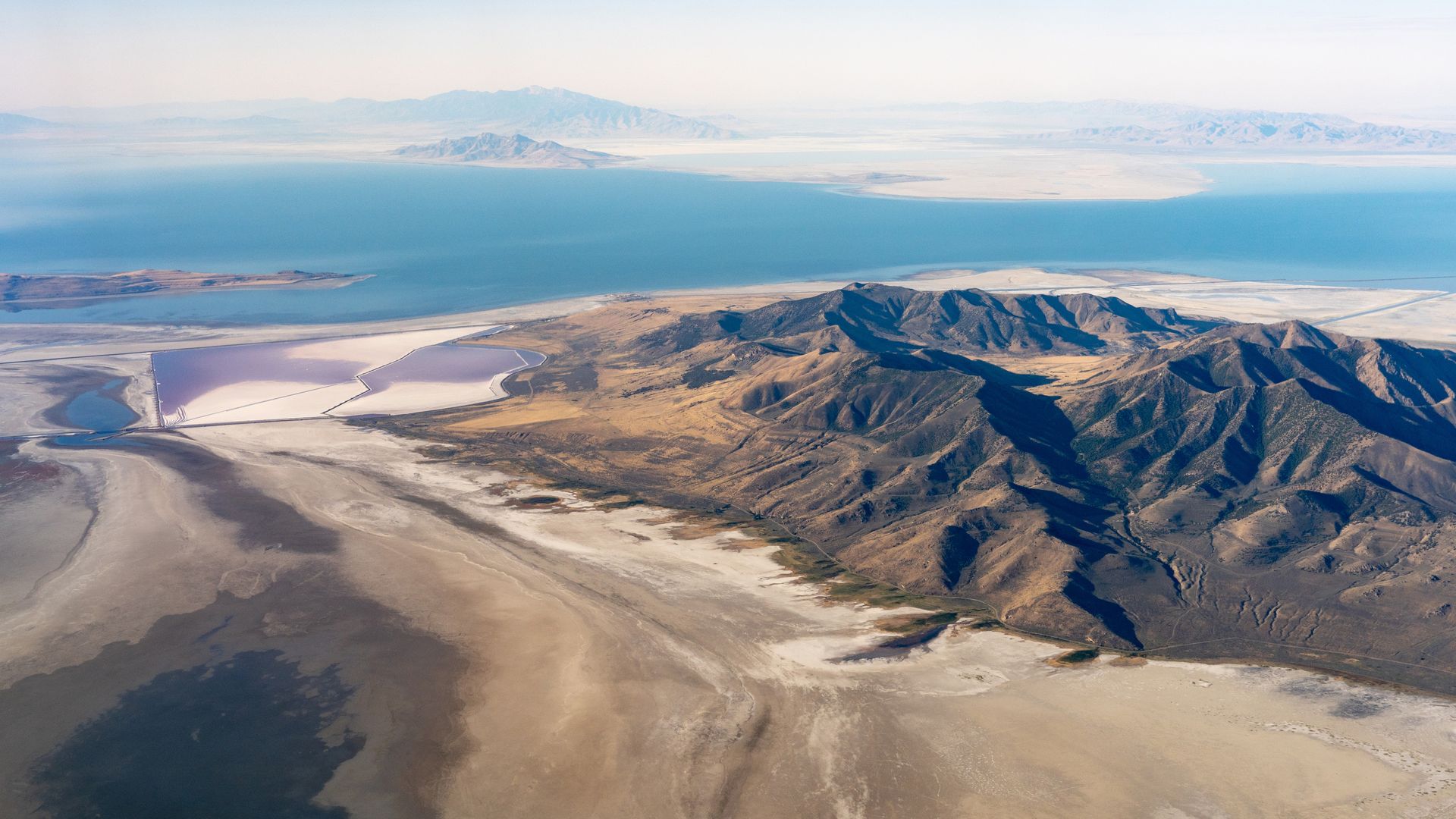 Aerial view of Promontory Mountains and Pleistocene shorelines of Glacial Lake Bonneville. Great Salt Lake, Utah, in background. Photo: Marli Miller/UCG/Universal Images Group via Getty Images