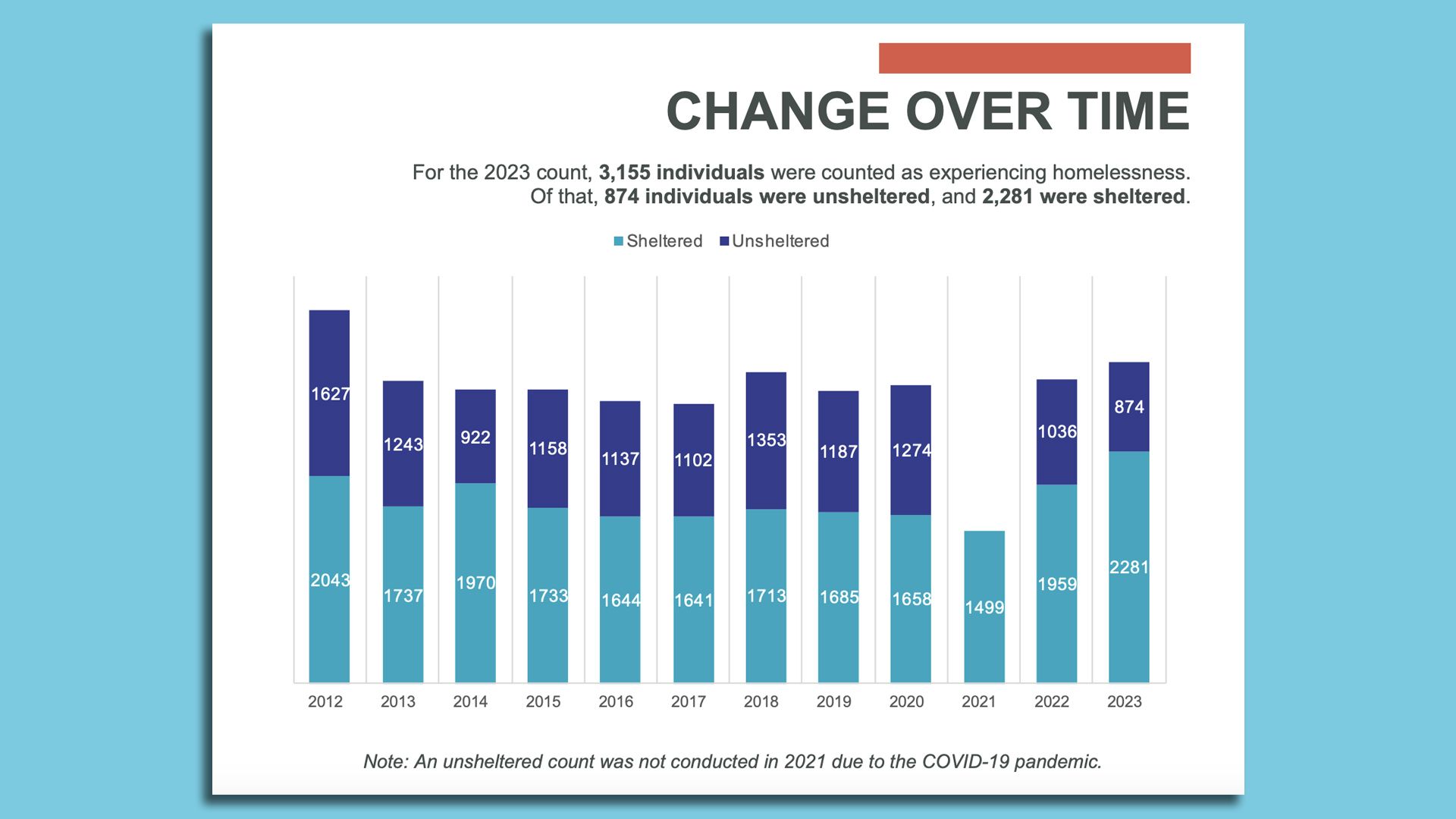 - In the 2023 count, 3,155 people in the county were experiencing homelessness. Of those, 874 were unsheltered and 2,281 were sheltered.