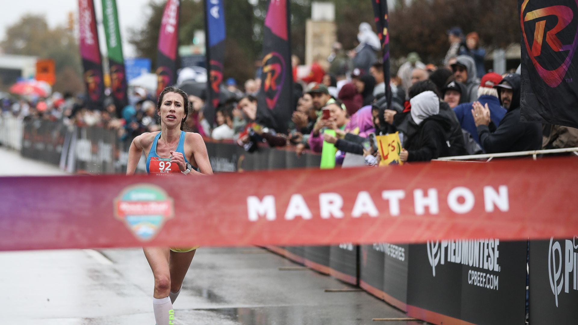 Janessa Dunn wins the women's elite division in the San Antonio Rock 'n' Roll marathon on Dec. 4, 2022. Photo: Meg Oliphant/Getty Images for Rock 'n' Roll Running Series