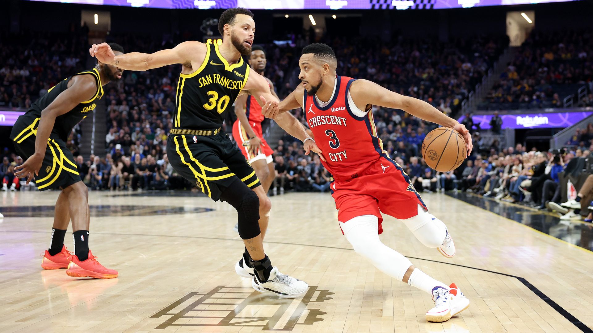 Stephen Curry (No. 30) guards CJ McCollum of the New Orleans Pelicans on Wednesday night. Photo: Ezra Shaw/Getty Images